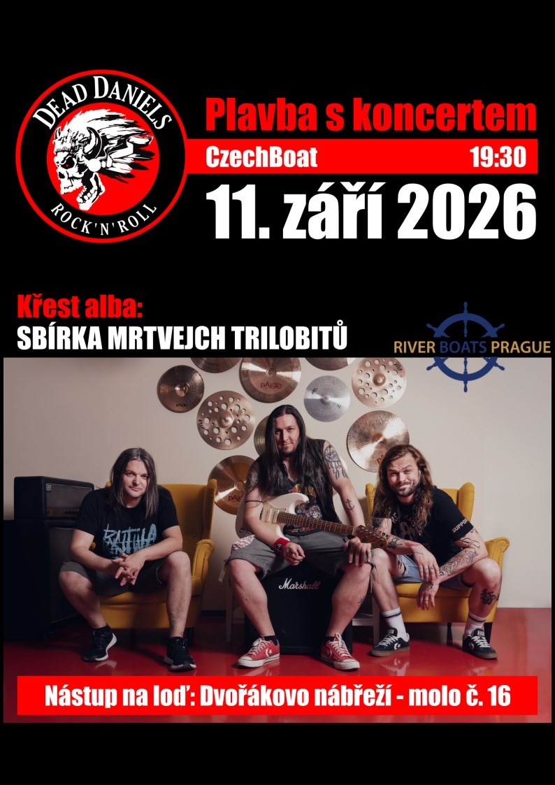 Vyplujte s Dead Daniels a zažijte jedinečný koncert na horní palubě Czech Boat s plavbou po Vltavě a křtem alba SBÍRKA MRTVEJCH TRILOBITŮ.Vyplouváme 11. září 2026 ve 20:00 s návratem ve 22:00. Nástup je na Dvořákově nábřeží – molo č. 16, tam kde kotví Kamina Boat. Po celou dobu plavby vám bude k dispozici plně vybavený spodní bar i výčep umístěný na horní palubě, kde bude probíhat koncert.Kapacita lodi je omezená, proto s nákupem palubních vstupenek rozhodně neváhejte.Akce probíhá ve spolupráci s lodní společností River Boats Prague, kterým za tuto příležitost moc děkujeme! A H O J