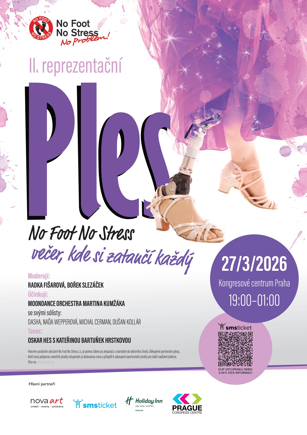 "Vysněné se stává skutečností "a my podruhé v historii České republiky máme tu čest Vás pozvat na jedinečný PLES NoFoot aneb když amputáři tančí. Akce je určena pro všechny, kteří chtějí být tento večer s námi a pořádně si to užít.Bavit nás bude MOONDANCE ORCHESTRA MARTINA KUMŹÁKA se svými sólisty. Večerem nás provede zpěvačka Radka Fišarová a Bořek Slezáček.Během večera se mužete také těšit na taneční překvapení a nebude chybět ani tradiční plesová tombola.Cílem akce je ukázat všem, že ani po amputaci život nekončí.A jelikož zatím všechny naše akce byly především o sportu, je tedy čas vyzout tenisky, pěkně se obléci a vyrazit na taneční parket. Více info na nofoot.cz