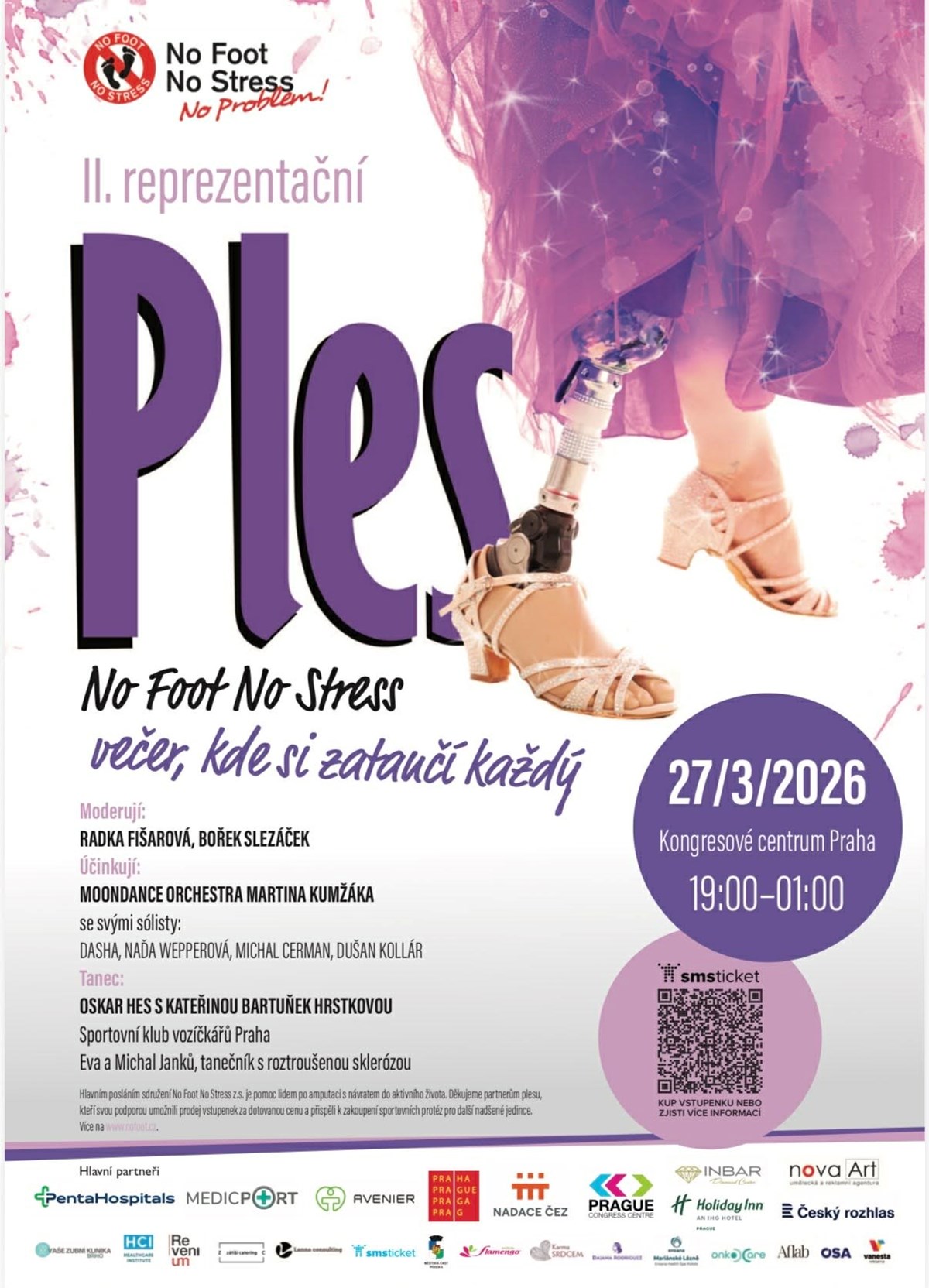 "Vysněné se stává skutečností "a my podruhé v historii České republiky máme tu čest Vás pozvat na jedinečný PLES NoFoot aneb když amputáři tančí. Akce je určena pro všechny, kteří chtějí být tento večer s námi a pořádně si to užít.Bavit nás bude MOONDANCE ORCHESTRA MARTINA KUMŹÁKA se svými sólisty. Večerem nás provede zpěvačka Radka Fišarová a Bořek Slezáček.Během večera se mužete také těšit na taneční překvapení a nebude chybět ani tradiční plesová tombola.Cílem akce je ukázat všem, že ani po amputaci život nekončí.A jelikož zatím všechny naše akce byly především o sportu, je tedy čas vyzout tenisky, pěkně se obléci a vyrazit na taneční parket. Více info na nofoot.cz
