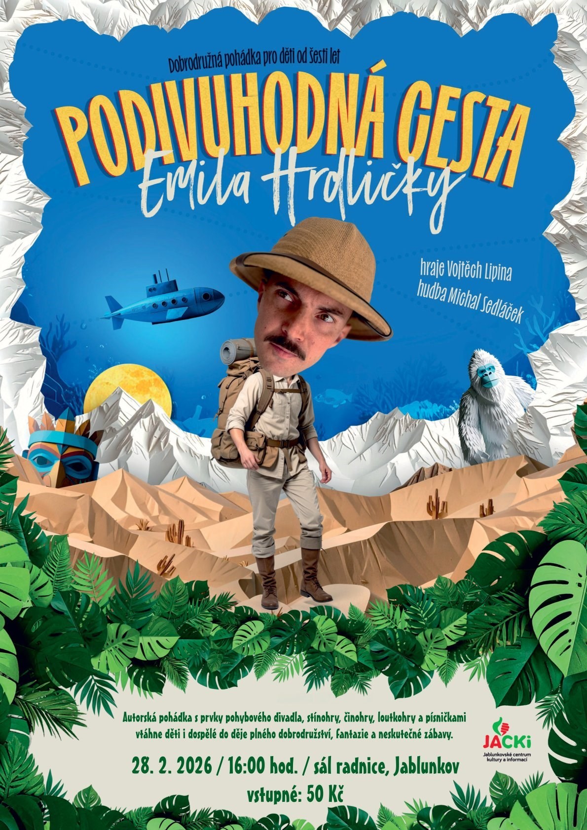 ,,Tropické pralesy, neprostupná džungle, rozpálená poušť, zamrzlé vrcholky Himálajské, největší přístavy i města světa, to všechno jsem viděl, tam všude jsem byl. A o tom všem vám chci vyprávět příběh, příběh tajemný a záhadný jako nekonečné hlubiny oceánů. Příběh o tom, jak jsem se vydal hledat ten nejvzácnější poklad světa.‘‘Představení s prvky pohybového divadla, stínohry, činohry, loutkohry a kdoví čím ještě. Vyrazte společně s dobrodruhem Emilem Hrdličkou v podání Vojtěcha Lipiny pátrat po nejvzácnějším pokladu světa. Možná ho najdete i vy!Pohádka pro rodiče s dětmi od šesti let.