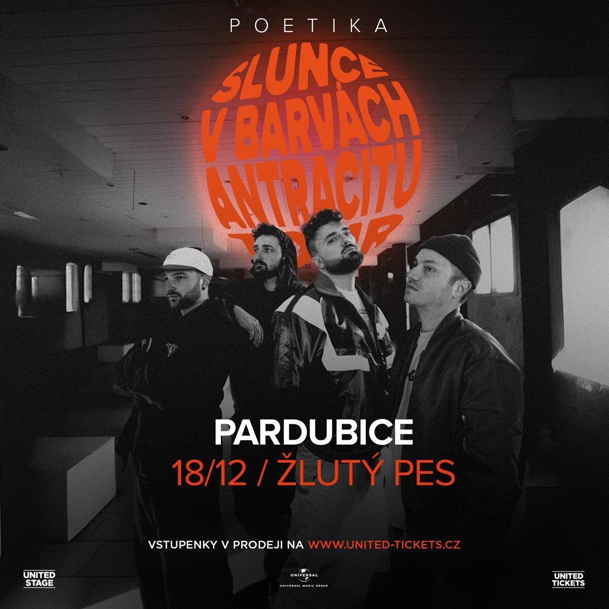 Kapela Poetika pokračuje na podzim 2025 ve svém tour k novému albu. Po pěti letech se vrací na pódia s novou show složenou nejen z hitů jako PŮLNOC, ZKOUŠÍM ŽÍT, KAŽDOU VTEŘINOU a MÁM POCIT, ŽE TĚ ZTRÁCÍM, a i dalších z písní z aktuální desky SLUNCE V BARVÁCHANTRACITU, která vyšla na začátku roku 2025. Fanoušci se mohou těšit na pro Poetiku typicky energické vystoupení, naživo zahrané singly z nového alba i naprosté novinky chystané na sezónu 2026. Nenechte si to ujít!