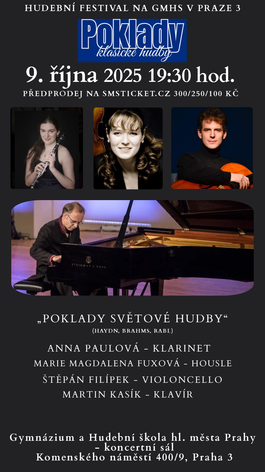 Koncerty se uskuteční v koncertním sále Gymnázia a Hudební školy hl.města Prahy (GMHS) - Komenského náměstí 400/9, Praha ŽižkovProgram:„Poklady světové hudby“Čtvrtek - 9. října 2025 – začátek 19:30 hod. - J. Haydn – Klavírní trio G dur, Hob. XV. 25- J. Brahms – Klarinetové trio op. 114- Walter Rabl – Kvartet pro klavír, housle, klarinet a cello op.1 Anna Paulová - mladá klarinetistka – držitelka ceny Jiřího BělohlávkaMarie Magdalena Fuxová - vítězka mnoha mezinárodních soutěží a vyučující na této škole – houslistka Štěpán Filípek - český violoncellista a skladatel Martin Kasík - známý český klavírista, laureát soutěže Pražské Jaro, Young Concerts Artists, Davidoff Prix...