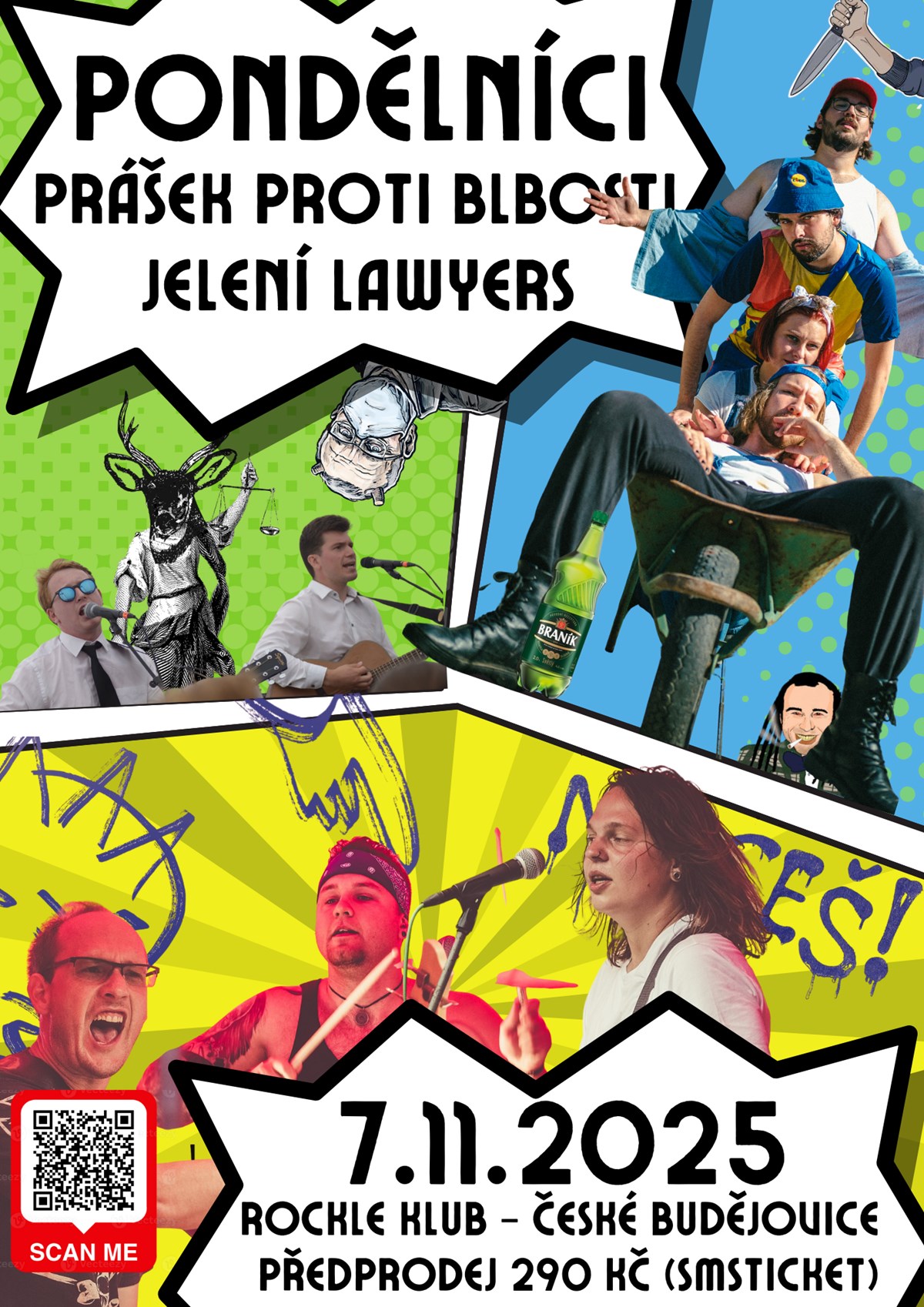 Pondělníci se vydávají opět se svojí nejhorší show do Českých Budějovic za doprovodu právnické lůzy Jelení Lawyers a lokalních dealerů Prášek proti BlbostiPONDĚLNÍCIJELENÍ LAWYERSPRÁŠEK PROTI BLBOSTI