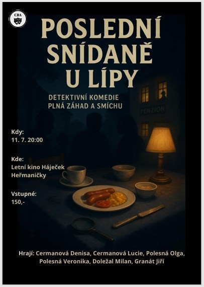 Divadlo CBA uvede v Heřmaničkách detektivní komediální kus.Poslední snídaně U Lípy je detektivní komedie odehrávající se v jinak poklidném penzionu, kde jednoho rána naruší rutinz hostů nečekaná vražda.Z nevinné snídaně se stává vyšetřování plné komických situací, podezření a postupně odhalovaných tajemství.S přibývajícími indiciemi vyplouvají na povrch skryté motivy všech přítomných.Inscenace s krátkou přestávkou vtahuje diváky do děje a vybízí je, aby se během představení pokusili odhalit, kdo je vrah