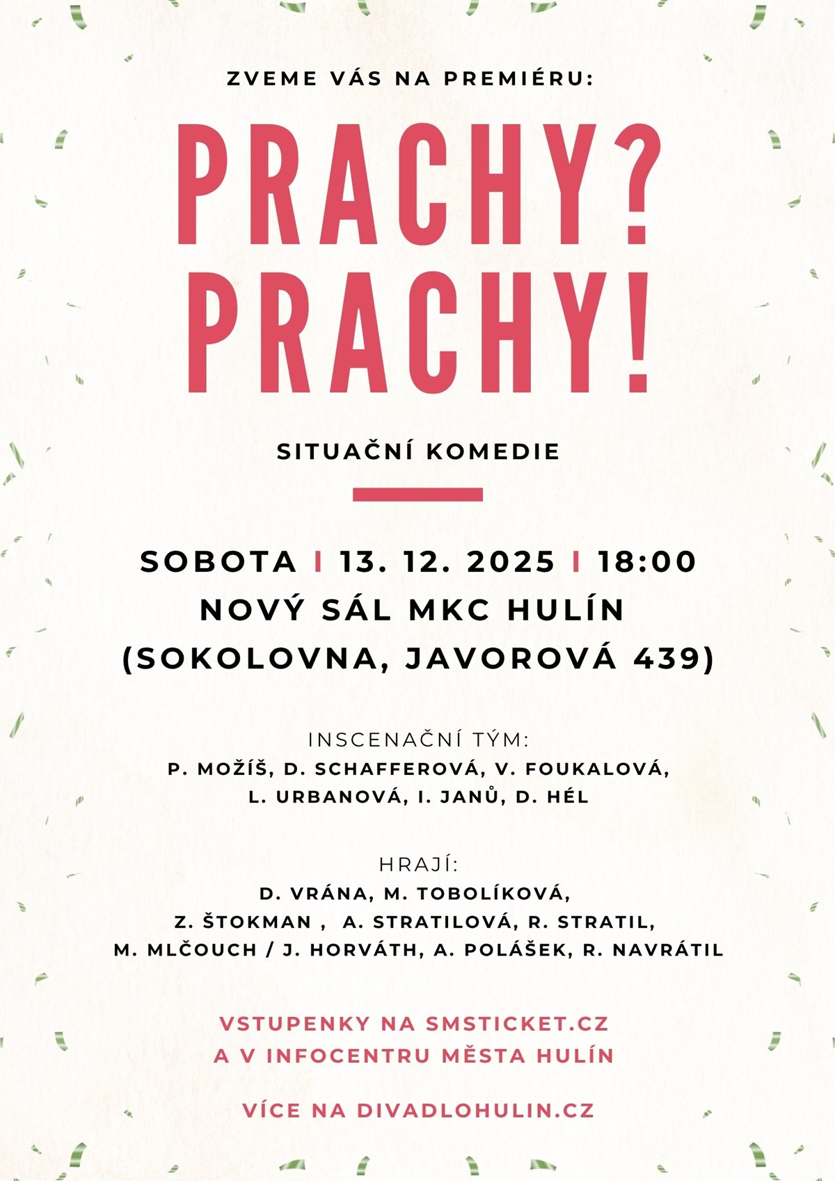 Srdečně Vás zveme na nejnovější inscenaci Divadla Hulín Prachy? Prachy! Premiéra situační komedie proběhne 13. 12. 2025 od 18:00 v sále MKC Hulín.HRAJÍ: D. VRÁNA, M. TOBOLÍKOVÁ, Z. ŠTOKMAN, A. STRATILOVÁ, R. STRATIL, M. MLČOUCH, J. HORVÁTH, A. POLÁŠEK, R. NAVRÁTILCena vstupenky je 250 Kč. Vstupenky můžete zakoupit online nebo osobně v TIC Hulín.Těšíme se na Vás.
