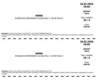 Prodám 2 vstupenky na vyprodané představení „Hana“ ve Vinohradském divadle dne 16. února. Bohužel mi termín nevyhovuje. Cena 420 Kč za kus.