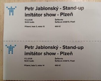 Prodám dvě vstupenky na Stand Up show imitátora Petra Jablonského v Šeříkovce, 17.2.2026 od 19:00 , 5.řada sedadla 14 a 15. Oba lístky nechám dohromady za 500 Kč, Původní cena za oba lístky 1000 Kč.
