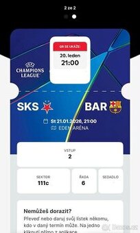 Prodám vstupenku na zápas Ligy mistrů Slavia - Barcelona. Převod do aplikace Slavia. Cena 3900 Kč.