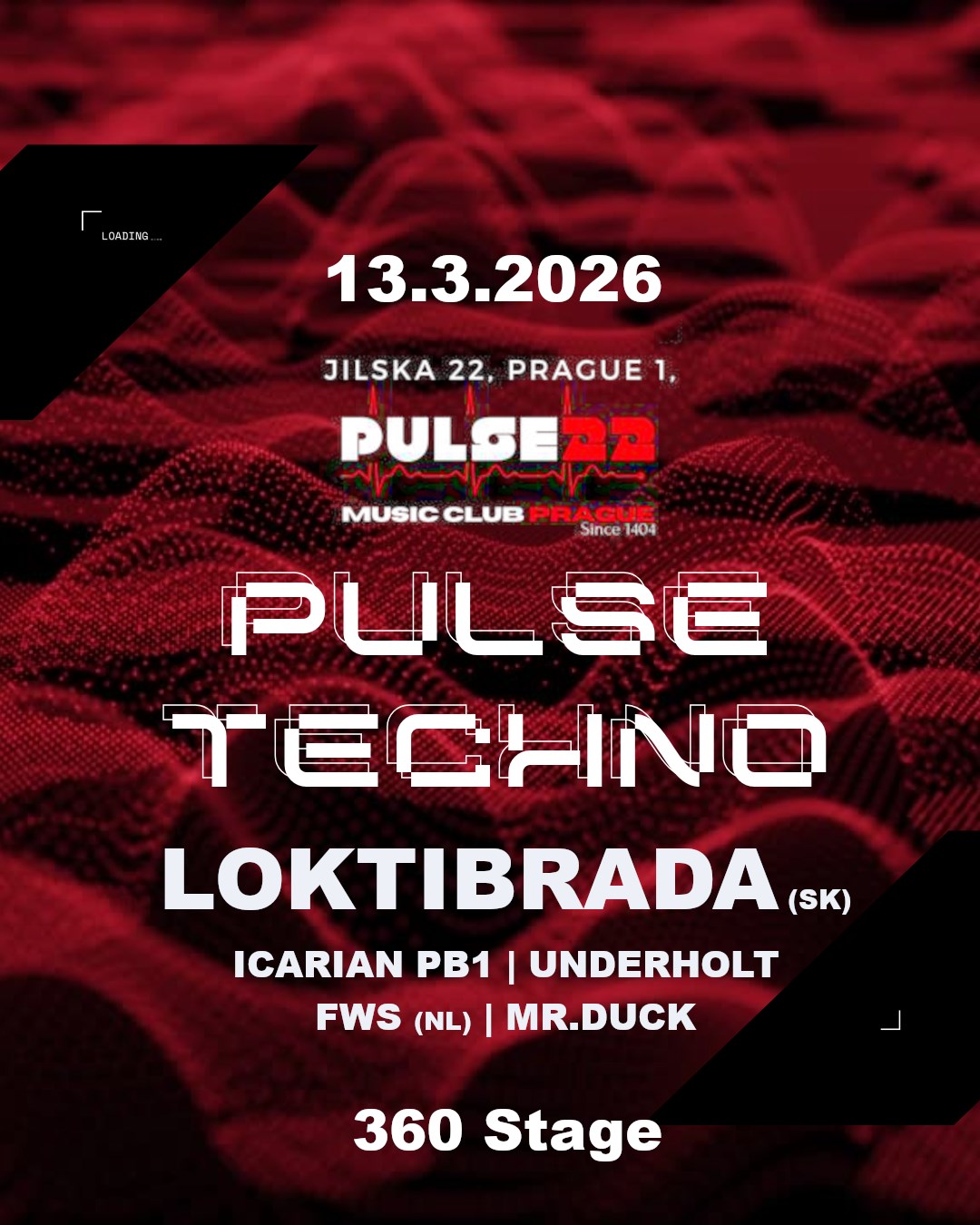 Pulse Techno přináší výjimečnou noc Raw, Deep & Hypnotic Techna! Speciální 360 stage kolem DJs!🤘 Naše crew Pulse Techno přiveze legendu, která tvořila základy techno scény ve střední Evropě – a to opravdu výjimečně v Praze! Lineup:Loktibrada (SK)Icarian PB1UnderholtFWS (NL)MR.Duck 🎧 Loktibrada – skutečná legenda slovenské a středoevropské techno scény. Profesionálně DJingem aktivní od roku 1994, působil pod různými jmény (např. DJ Dalo) a stal u zrodu kultovních klubů jako U Club / Subclub v Bratislavě – místa, které ovlivnilo techno komunitu celé generace. Loktibrada stojí za několika klíčovými techno projekty a labely, spolupracoval s jinými ikonami elektronické scény a jeho produkce a DJ sety byly vydávány na vinylu i na berlínském Tresor labelu. 🎧Icarian PB1Icarian PB1 je techno DJ a producent aktivní od devadesátých let (původně DJ Flashback), známý svou všestranností jako digitální DJ, vinylový DJ a live act. Jeho hudba vychází na labelech jako Bass Controllism a NO PAIN Records, je zakladatelem seskupeni Pulse Techno. 🎧Underholtje členem Pulse Techno Crew a rezidentem pražského klubu Pulse 22. Je známý svým syrovým a temným zvukem, který stojí na hypnotických rytmech a pulzující energii. Ve svých setech vytváří plynulý, gradující zážitek, který tě vtáhne a nepustí až do posledního beatu. Pravidelně sdílí stage s dalšími rezidenty Pulse Techno a upevňuje svou pozici na české techno scéně. 🎧 FWS (Fox With Socks) je projekt všestranného DJe, producenta a uznávaného mixing & mastering engineera působícího v nizozemském Haagu. Ve svých setech propojuje dub, break a techno do hlubokého, rytmického a hypnotického zvuku, kde se organicky potkává hardware i software. Jeho groove-driven selekce a tribal energie vytvářejí pohlcující taneční cestu plnou textur, atmosféry a elektrizujícího napětí na parketu. 🎧 MR.DuckVinyl DJ z Přerova. Hudba je jeho vášní od dětství – vyrůstal ve velké rodině muzikantů. Klasické nástroje ho ale nikdy úplně neoslovily, zato elektronická hudba byla jasná volba.V minulosti měl live projekt U-bend, se kterým procestoval celou Českou republiku. Jeho srdce patří gramofonům a po více než 20 letech hraní si našel svůj vlastní směr. Temné, experimentální techno. Vinyl feeling. Groove, který tě nepustí z parketu. 💣 Techno – Raw – Deep – Hypnotic 💣Připrav se na jedinečnou noc, kde legendy potkají současnost. 📍 Pulse 22📅 Pátek, 13. březen, 2026🕙 Start: 22:00 🎟️ Tickets:✅ Presale: 150 Kč✅ At the door: 200 Kč--------------------------------Pulse Techno brings an exceptional night of Raw, Deep & Hypnotic Techno!Special 360 stage around DJs!🤘Our Pulse Techno crew is bringing a legend who helped shape the foundations of the techno scene in Central Europe — appearing very rarely in Prague! Lineup:Loktibrada (SK)Icarian PB1UnderholtFWS (NL)MR.Duck 🎧 Loktibrada – a true legend of the Slovak and Central European techno scene. Professionally active as a DJ since 1994, he has performed under various aliases (including DJ Dalo) and was involved in the creation of iconic clubs such as U.Club / Subclub in Bratislava — venues that shaped the techno community for an entire generation.Loktibrada stands behind several key techno projects and labels, has collaborated with other electronic music icons, and his productions and DJ sets have been released on vinyl as well as on Berlin’s legendary Tresor label. 🎧 Icarian PB1 – is a techno DJ and producer active since the 1990s (originally performing as DJ Flashback), known for his versatility as a digital DJ, vinyl DJ, and live act. His music has been released on labels such as Bass Controllism and NO PAIN Records, and he is the founder of the Pulse Techno collective. 🎧 Underholt – is a member of the Pulse Techno Crew and a resident DJ at Prague’s Pulse 22 club. He is known for his raw and dark sound built on hypnotic rhythms and driving energy. In his sets, he crafts a seamless, gradually intensifying experience that pulls you in and doesn’t let go until the very last beat. He regularly shares the stage with fellow Pulse Techno residents, strengthening his position within the Czech techno scene. 🎧 FWS (Fox With Socks) – is a project by a versatile DJ, producer, and respected mixing & mastering engineer based in The Hague, Netherlands. In his sets, he blends dub, break, and techno into a deep, rhythmic, and hypnotic sound where hardware and software merge organically. His groove-driven selection and tribal energy create an immersive dancefloor journey full of texture, atmosphere, and electrifying tension. 🎧 MR. DuckA vinyl DJ from Přerov. Music has been his passion since childhood — he grew up in a large family of musicians. Classical instruments never fully connected with him, but electronic music was an obvious choice.In the past, he ran the live project U-bend, with which he toured across the Czech Republic. His heart belongs to turntables, and after more than 20 years of playing, he has found his own direction. Dark, experimental techno. Vinyl feeling. A groove that won’t let you leave the dancefloor. 💣 Techno – Raw – Deep – Hypnotic 💣Get ready for a unique night where legends meet the present. 📍 Pulse 22📅 Friday, March 13, 2026🕙 Start: 22:00 🎟️ Tickets:✅ Presale: 150 CZK✅ At the door: 200 CZK