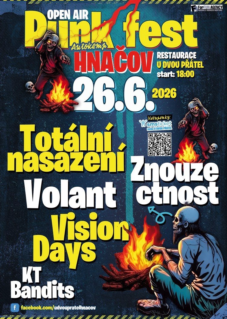 Pankáči míří do kempu. Kempovat ani pojídat salát kemping rozhodně nebudou. Směs alternativního, folk, ska, rock punku v provedení toho nejlepšího u nás.Line up18:00 – 18:45 KT BANDITS19:15 – 20:15 ZNOUZECTNOST20:45 – 21:45 TOTÁLNÍ NASAZENÍ22:15 – 23:15 VISION DAYS23:45 -00:45 VOLANT