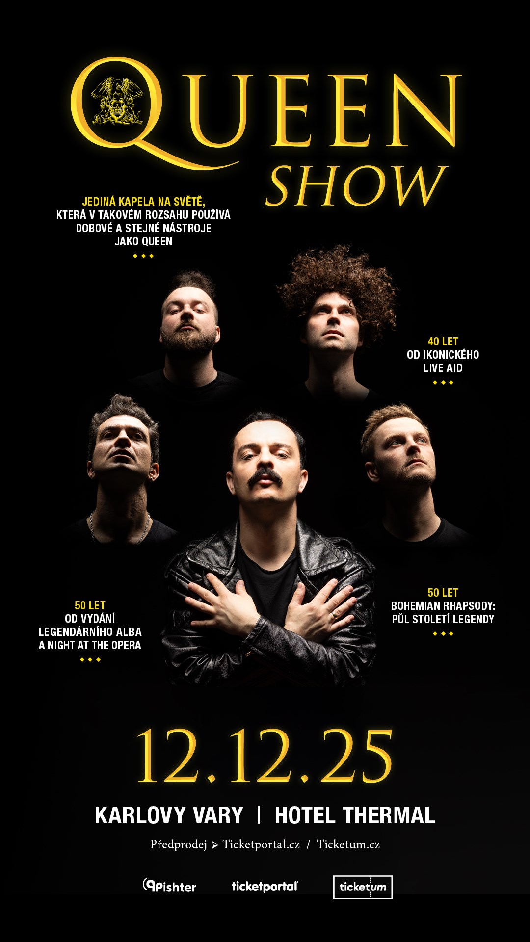 QUEENSHOW /2025/ – Bohemian Rhapsody: Půl století legendy a oslava 40. výročí legendárního koncertu Live Aid (1985).Přijďte zažít nezapomenutelný koncert skupiny QUEENSHOW, která vzdává hold nesmrtelné hudbě Freddieho Mercuryho a QUEEN! U příležitosti 40. výročí legendárního koncertu Live Aid (1985) a 50 let od vydání ikonické „Bohemian Rhapsody“, která se stala jednou z největších písní všech dob, vás čeká večer plný největších hitů, jako jsou „We Will Rock You“, „Radio Ga Ga“, „We Are the Champions“, či „Bohemian Rhapsody“. Připomeňte si vystoupení na Live Aid (1985), které změnilo hudební historii. Nechte se unést energií, vášní a dokonalou show v duchu QUEEN!QUEENSHOW je jediná tribute kapela na světě, která na svých vystoupeních používá tak rozsáhlý výběr dobových nebo dokonce stejných nástrojů, jaké používal QUEEN na svých koncertech! Díky své neuvěřitelné autenticitě, která dokonale zachycuje nejen zvuk, ale i magii a energii původní formace, je uznávána jako jedna z nejlepších QUEEN tribute kapel vůbec. Každý koncert je oslavou mistrovství Queen a jejich nadčasového odkazu, každé vystoupení QUEENSHOW je jedinečným zážitkem, který vás přenese do doby, kdy Freddie Mercury ovládal pódia a hudba QUEEN dobývala svět.Od roku 2024 se kapele připojil italský hudebník Marco Giuseppe Di Marco, uznávaný ve světě QUEEN jako brilantní kytarista, který dokáže s precizností napodobit nezaměnitelnou techniku Briana Maye. Jeho hra přidává vystoupení další úroveň dokonalosti a autentičnosti, což dělá z QUEENSHOW výjimečnou hudební událost, kterou si nesmíte nechat ujít!
