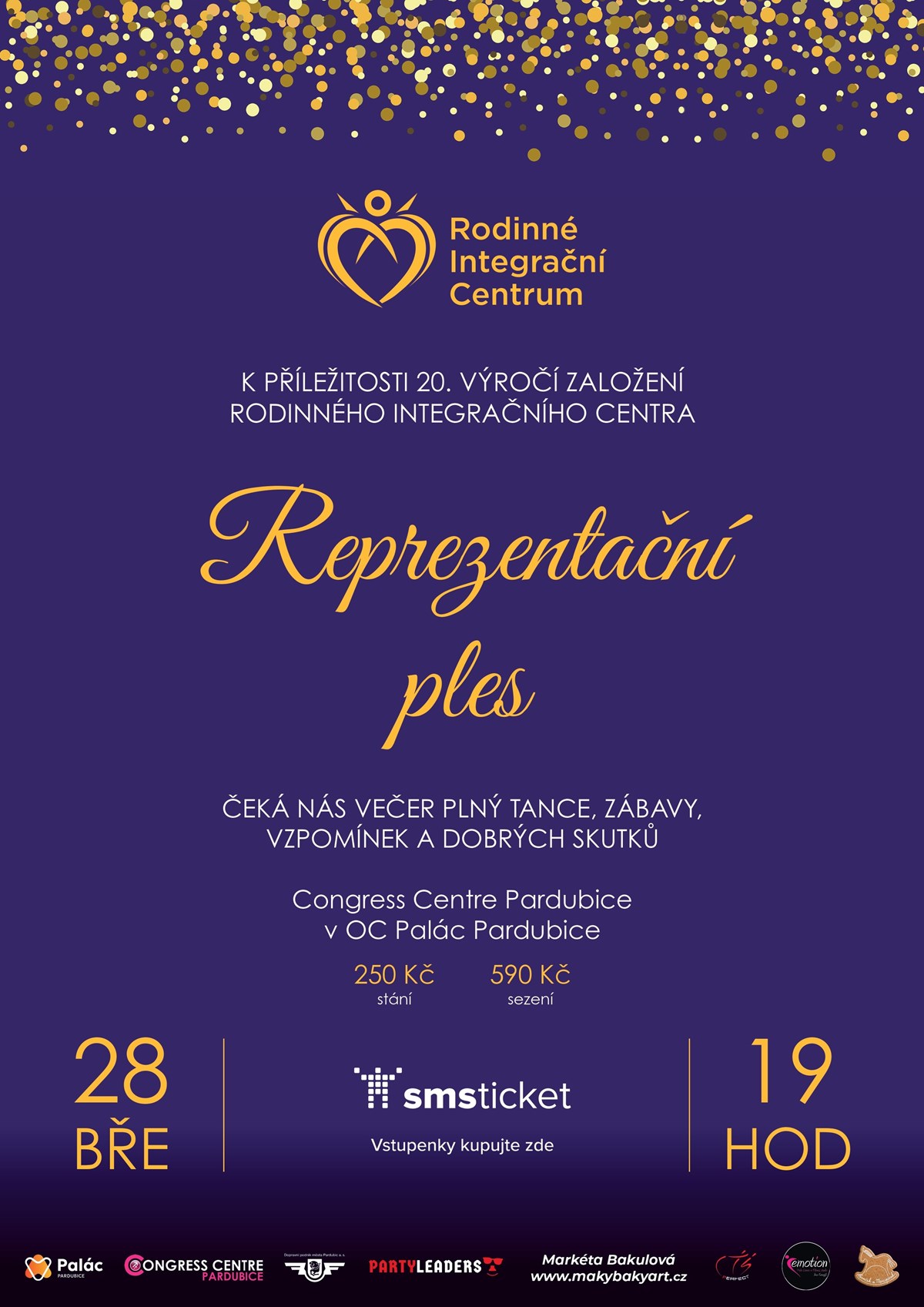 Reprezentační ples k příležitosti 20. výročí založení Rodinného Integračního Centra z.s.Přijďte s námi oslavit dvě desetiletí práce, radosti, výzev a společně sdíleného poslání. Čeká nás večer plný hudby, tance, zábavy, vzpomínek a dobrých skutků.Veškerý výnos z koupě vstupenek a lístků do tomboly podpoří náš projekt Sluněnka a zároveň budete mít příležitost zvážit podporu nášeho regionálně významného projektu "Srdcem k domovu", kdy plánujeme zřídit nový domov pro osoby se zdravotním postižením a odlehčovací služby v Lánech na Důlku u Pardubic. Více informací níže!Kdy: 28. 3. 2026 | 19:00 – 02:00 hod.Kde: Congress Centre Pardubice (v OC Palác Pardubice)Vstupné: 250 Kč za stání | 590 Kč za sezeníNa co se můžete těšit:Živá hudba k tanci i poslechu v podání skvělé kapely Party Leaders, která roztančí celý sál.Večerem Vás provede moderátor Ondřej Pokorný, který se postará o příjemnou atmosféru a plynulý průběh celého programu.Strhující vystoupení tanečních párů z CTS Perfect studia, které vás vtáhnou do světa elegance a rytmu.Dvě vystoupení folklorního souboru Perníček, jež přinesou na parket radost, tradici a energii lidového tance.Závěrečné vystoupení studia Emotion Pole Dance Chrudim, které přidá večeru špetku emocí, síly a uměleckého dojmu.Charitativní tombola, jejíž celý výtěžek poputuje na podporu dětí a osob s autismem v rámci projektu nových prostor „Sluněnky“ v Lanškrouně.Společně dokážeme rozdávat naději. Pojďte do toho s námi!Informace o projektu DOZP v Lánech na Důlku a Sluněnce naleznete zde:www.ric.cz/podporte/