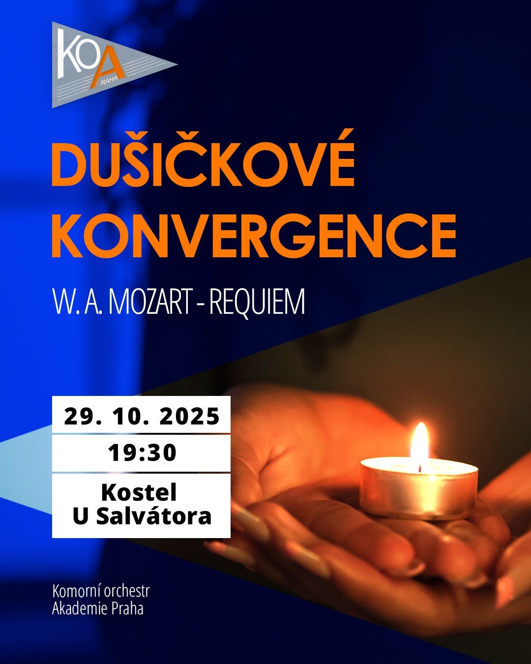 Komorní orchestr Akademie Praha Vás zve na dušičkový koncert, na němž zazní slavné Mozartovo Requiem. Spoluúčinkují:Bronislava Tomanová – soprán Karolina Bubleová Berková – alt Vladimír Doležal – tenorLukáš Hynek - Krämer – bas Pěvecký sbor ČVUT Komorní orchestr Akademie PrahaDirigent: Pavel HryzákKomorní orchestr Akademie Praha (KOA) byl založen v r. 1987 při Československé akademii věd, jejíchž několik vědeckých pracovníků - amatérských hudebníků a milovníků komorní hudby- stálo u jeho zrodu. Postupně se KOA rozrůstal (převážně o další vyspělejší amatéry, ale i o studenty či učitele hudby) až do dnešní podoby čítající cca 40 stálých členů. Od roku 2004 je šéfdirigentem a uměleckým vedoucím Pavel Hryzák.https://www.youtube.com/@KOAPrahaDěti do 10 let vstup na koncert zdarma. Kostel pro veřejnost otevřen od 19:00.Kostel je vytápěn.