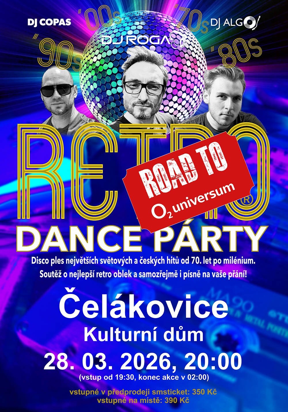 V rámci našeho největšího turné, které bude zakončeno 20. 11. 2026 v O2 universum v Praze, jsme samozřejmě na jaře zase v Čelákovicích! RETRO DANCE PÁRTY je disco ples těch největších hitů od sedmdesátých let až po milénium. Zkrátka od Abby přes Modern Talking až po Rihannu.Přijďte klidně v džínech, ale nejlépe retro! Nejlepší dobové kostýmy budou odměněny v naší velké soutěži. Hlavní cenou jsou vstupenky na naši mega show do O2 universa v Praze! Těšit se můžete na opět rozsáhlejší světelný park a hity našeho mládí v originálních verzích. Doba je zlá, tak tancujme, dokud můžeme!Vstup od 19:30, konec 02:00 hod.Vstupné v předprodeji 350 Kč, na místě 390 Kč.