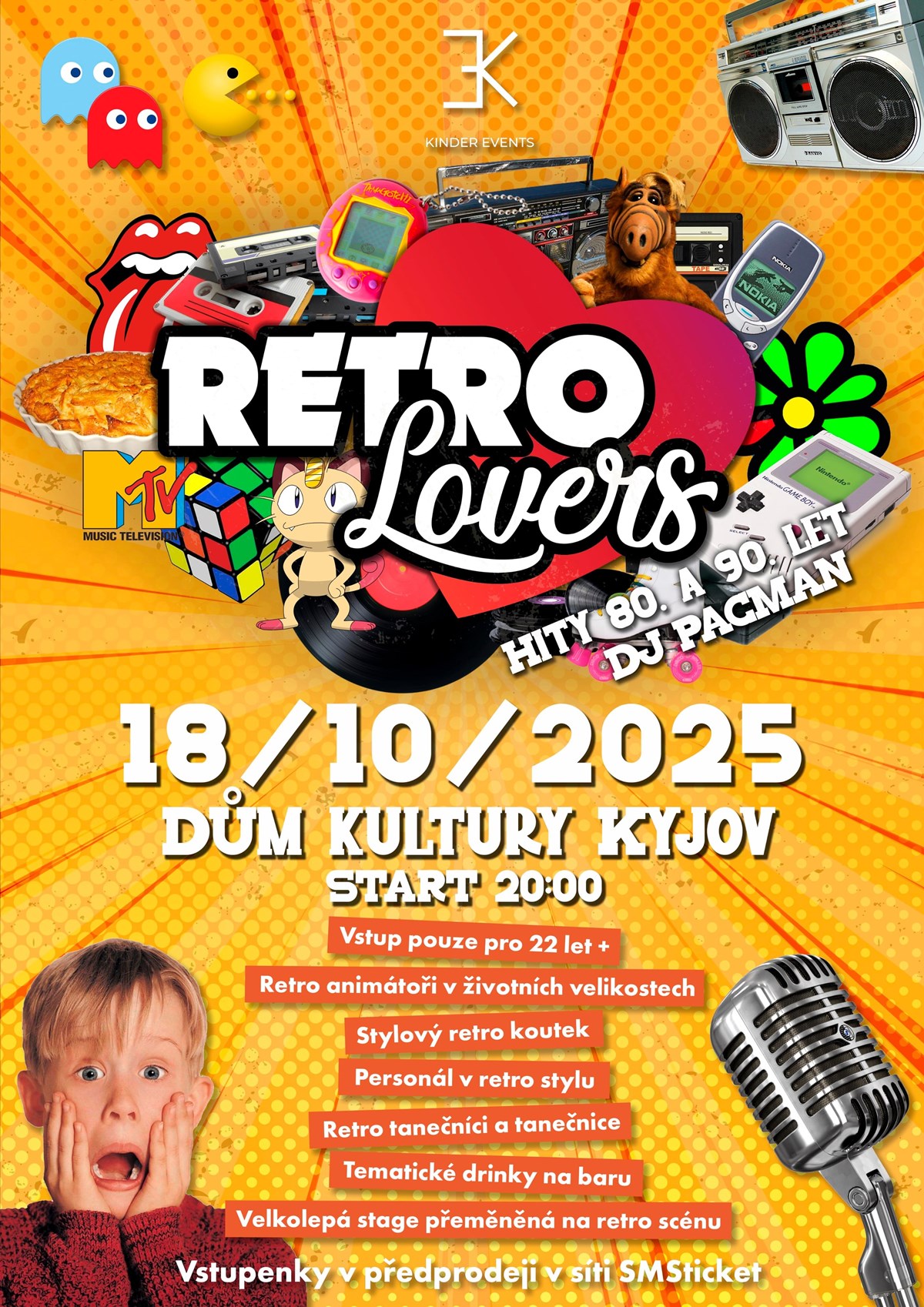 Dovolte, abychom Vás pozvali na nejoriginálnější párty ve stylu 80. a 90. let, která tu kdy byla! Připravili jsme pro vás akce plné nostalgie, zážitků, skvělé hudby a zábavy! Na akci na Vás čeká nadupaný program, obrovské množství retro dekorací, retro tanečnice, Stylový fotokoutek, tematické drinky na barech a spousta zážitků! Přicházíme s akcí, která tu ještě nebyla! DJ PAC-MANNa co se můžete těšit?!Po celý večer pouze hity z 80. a 90. let Vstup pouze pro 22 + (PS. Akce se stvořena hlavně především pro ty, kteří tuto dobu zažili a nebo se v ní narodili) Personál v retro styluRetro tanečnice na podiuRetro animátoři v životních velikostechStylový retro fotokoutekBudeme hrát i písničky na přání( POUZE rok 2000 a starší)Tematické drinky na baruVelkolepá stage přeměněná na retro scénu s retro TV projekcí(exkluzivní v ČR)OBROVSKÉ množství dekorací VSTUPENKY:Vzhledem k velkému zájmu, který předpokládáme doporučujeme vstupenky zakoupit dopředu v síti SMSticket nebo přímo v Infocentru v Kyjově.Upozornění: Kapacita sálu je omezená a po vyprodání, žádné další vstupenky již nebudou▪️POUZE PRO 22 + (Upozornění, věk budeme poctivě kontrolovat u vstupného) ▪️250 Kč/ osobaTěšíme se na perfektní zážitek Vaše Retro Lovers!