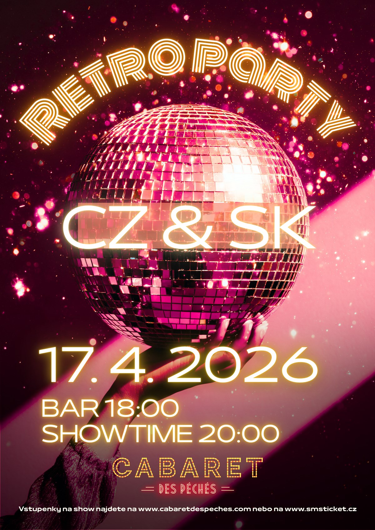 RETRO PARTYVečer, kdy se vrátíme do časů, kdy disco bylo životní styl.Čeká tě live disco night inspirovaná 70., 80. a 90. lety. Žádné pouštění playlistu – zpívá se naživo, tančí se naplno a atmosféra tě vtáhne hned od začátku.Uslyšíš ikonické hity v živém podání, uvidíš tanečníky, třpytivé kostýmy, světla i disko kouli. Zpěvačky i tanečníci budou nejen na pódiu, ale i mezi vámi – takže se klidně může stát, že se ocitneš přímo uprostřed dění.Co tě čeká:– živý zpěv největších disco hitů– taneční show během celého večera– retro vizuál, světla a pořádná dávka lesku– drinky inspirované minulými dekádami– možnost sedět, ale taky se zvednout a tančit, kdykoliv budeš chtítDress code doporučen: disco vibes!Flitry, lesk, zvony, platformy, glamour – nalaď se na atmosféru večera a buď jeho součástí.Přijď se blýsknout, roztančit a nechat unést nocí, kde cabaret potkává Studio 54.Gold. Glitz. Groove.Tenhle večer nebude jen vzpomínka – bude to disco, které zažiješ na vlastní kůži.BAR 18:00SHOW 20:00 Show je určena výhradně pro publikum starší 18 let - vstup osobám mladším 18 let není povolenUpozornění pro divákyTato inscenace obsahuje světelné efekty, včetně stroboskopických záblesků a rychle se měnících světelných sekvencí. U osob s fotosenzitivní epilepsií nebo zvýšenou citlivostí na intenzivní světelné podněty mohou tyto efekty vyvolat nepříznivé zdravotní reakce. Divákům, kterých by se tato skutečnost mohla týkat, se doporučuje zvýšená opatrnost.