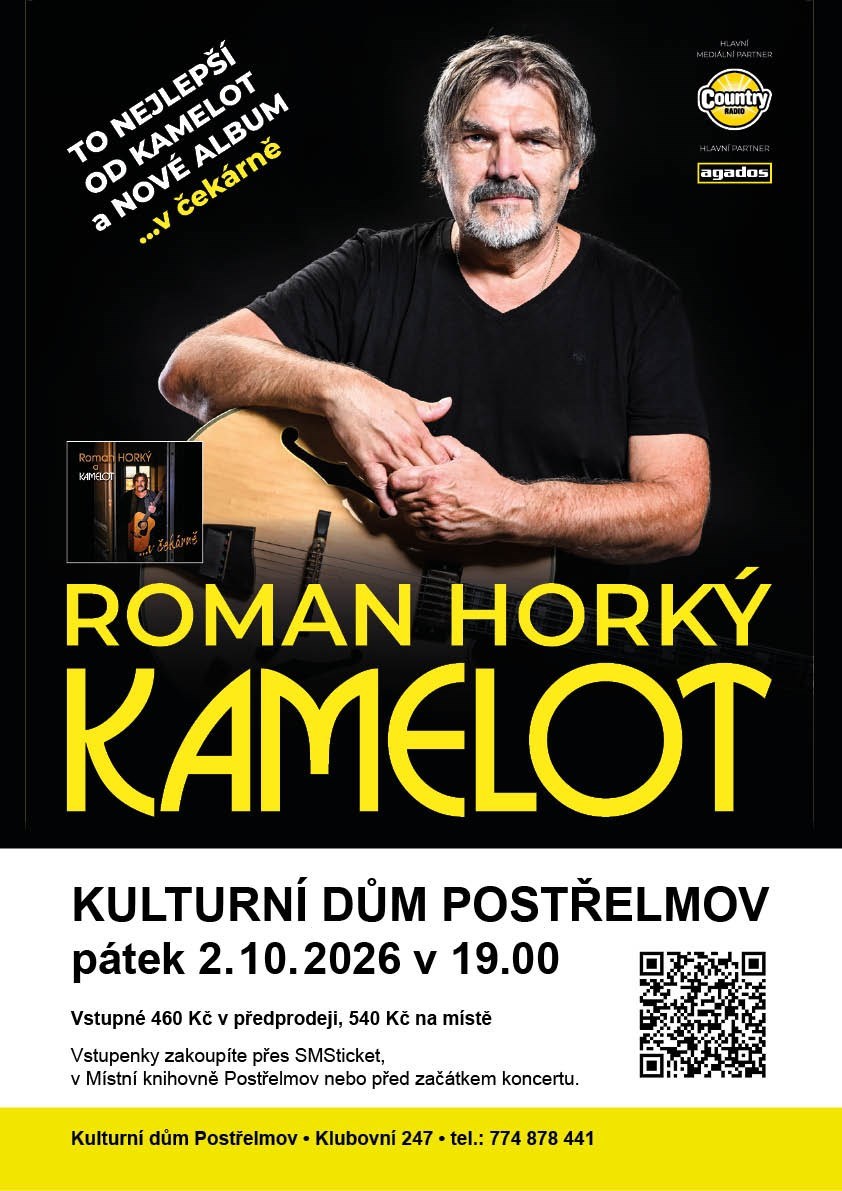 Roman Horký a Kamelot je partou skvělých muzikantů a zpěváků, která v nejvyššíhudební kvalitě zahraje v plném nasazení v divadelním sále, kulturním domu,sokolovně, na venkovních pódiích, festivalech, ale i u táboráku. Kamelot žijehudbou, autorskými skladbami a přináší návštěvníkům svých koncertůmimořádně krásné chvíle a hudební zážitky.V koncertním projektu „TO NEJLEPŠÍ OD KAMELOT“ (90 min.) apředstavením nového alba …v čekárně“ se skupina vrací ke skladbám ze dvouúvodních alb, k písním složeným v letech 1981 až 1991. K období, které daloKamelotu alba Zachraňte koně, Tajný výpravy a kdy se kapela zapsala do srdcítisíců posluchačů. Koncertní program je složen z těchto dnes již legendárníchskladeb jako Zachraňte koně, Cikáni, Amulet, Čas rozchodů, Psáno na březovékůře, Tajný výpravy, Krajina větrných mlýnů, Vzpomínka na kamaráda a dalšíchpísní prvního desetiletí kapely.„Zachraňte koně je první a nejúspěšnější studiové album skupiny Kamelot. Bylovydáno v roce 1990. Za téměř 100 tisíc prodaných nosičů bylo oceněnomultiplatinovou deskou. Titulní píseň Zachraňte koně se stala Hitem desetiletí vefolk a country hudbě.“V tomto koncertu Roman Horký a KAMELOT představí také několikskladeb z nového alba s názvem „…v čekárně“. Nové, nadžánrové album bylo jižpředstaveno posluchačům prvním hudebním klipem, skladbou „Magie gypsies“a dalším klipem na titulní skladbu „…v čekárně“!Uvedení dalších singlů a písní z tohoto alba v průběhu roku 2026 jesoučástí celoročního československého tour. Koncerty a křty alba byly zahájeny9. listopadu 2025 pražským koncertem v divadle Hybernia, dále pak tour pojedeČeskou republikou a bude mít i svoji část ve Slovenské republice. V Bratislavě seKamelot představil úspěšným koncertem na konci roku 2025 v DK Zrkadlový háj,kam se na konci roku 2026 zase koncertně vrátí. V tomto vystoupení zaznízkrátka celá řada největších hitů kapely i novinky. A jak je u Kamelotu příjemnýmzvykem i některé nečekané skladby z historie.