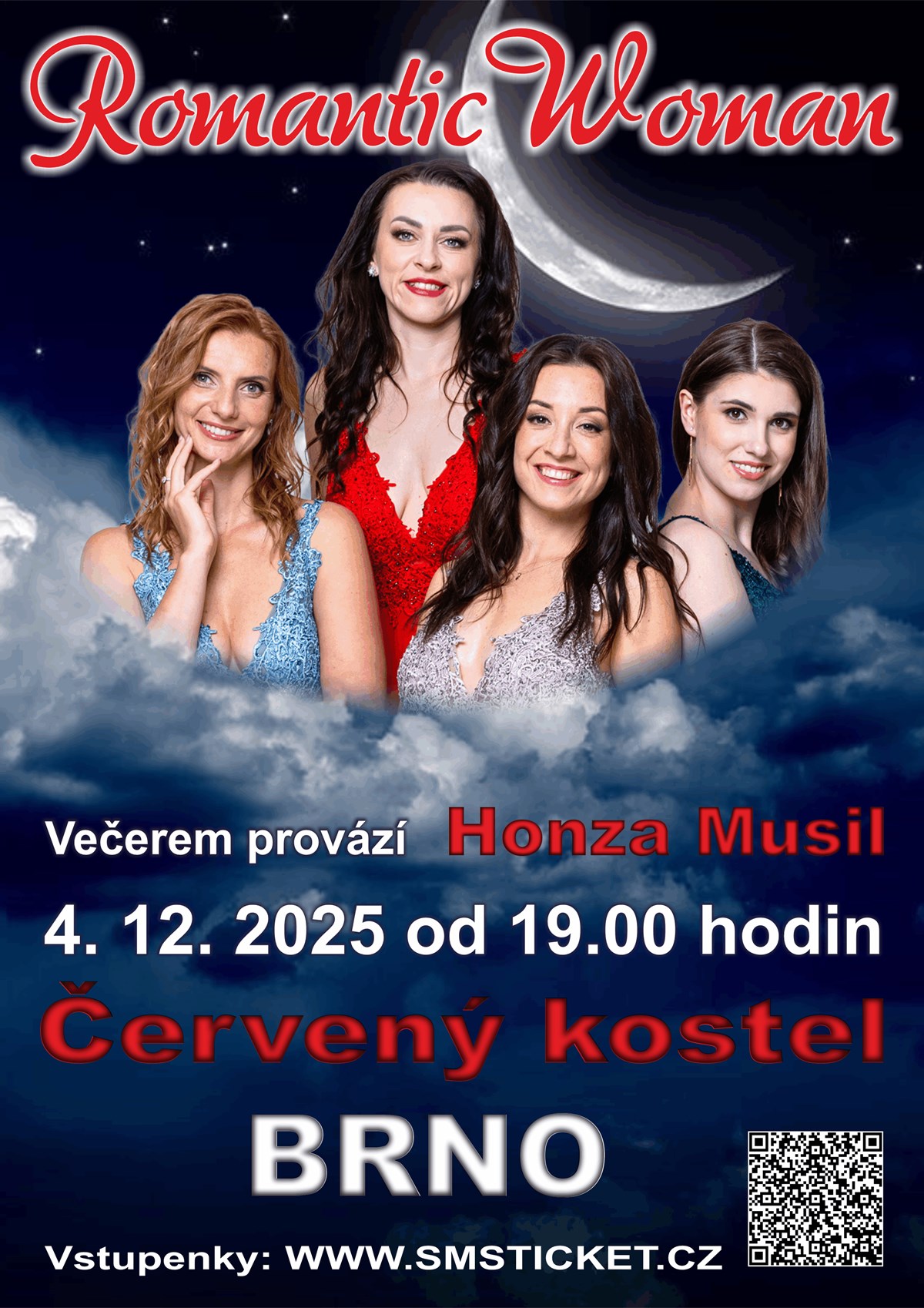 Romantic Woman - originální seskupení zpěvaček vás zve na romantický vánoční koncert do Červeného kostela v Brně.Připravené hudební aranže naživo doprovodí smyčce a skotské dudy. V keltském stylu zazní největší světové hity jako Amazing Grace, My Heart Will Go On, Loch Lomond, Nella Fantasia nebo vánoční O Holy Night, Adeste Fideles a mnoho dalších.Zpívají: Monika Sommerová, Jana Štěpánková, Barbora Konopásek Fialová a Veronika Vršecká Večerem provází moderátor Honza Musil