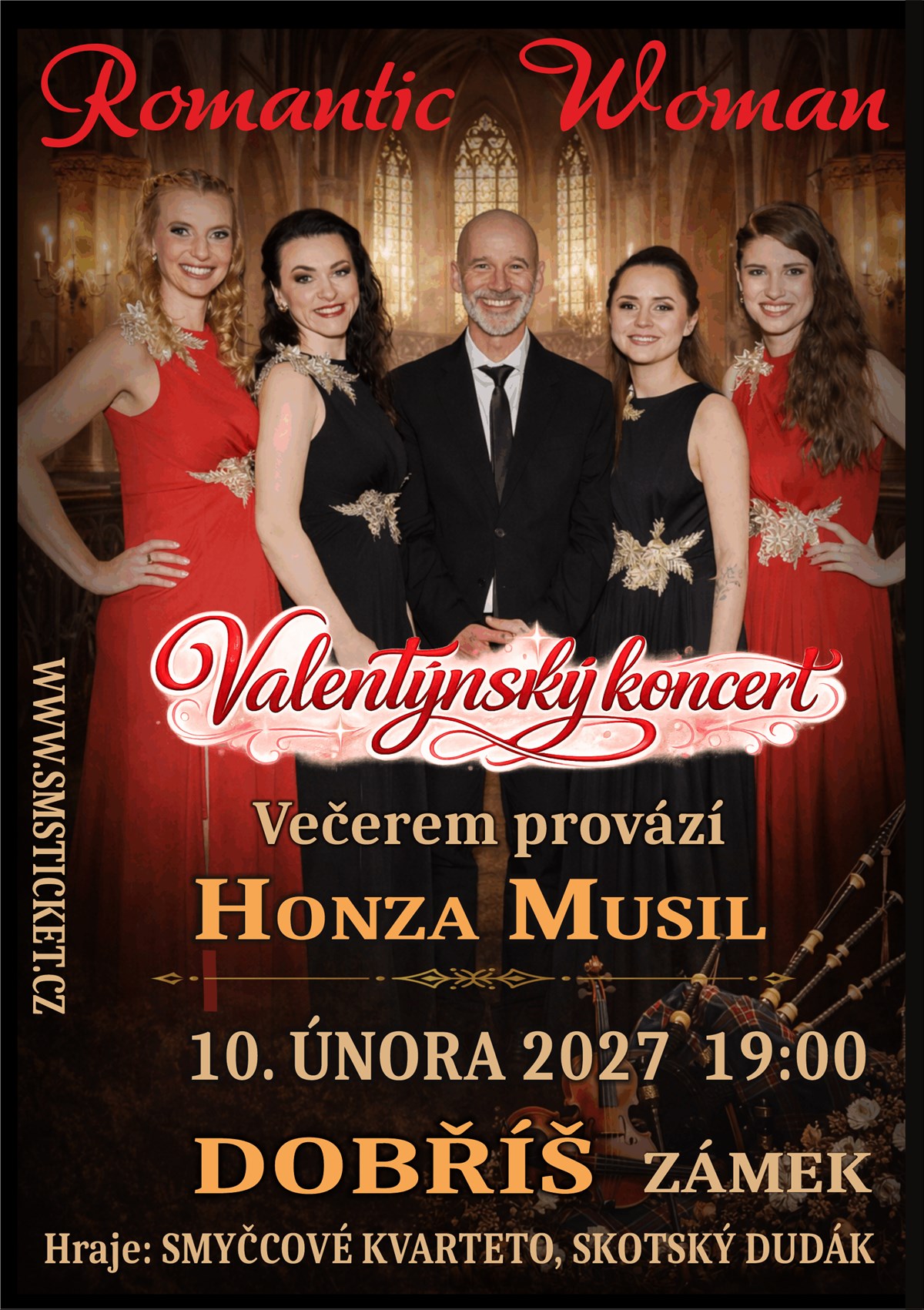 Romantic Woman - originální seskupení zpěvaček vás zve na romantický koncert do jedinečných prostor Zámku Dobříš.Připravené hudební aranže naživo doprovodí smyčcové kvarteto a skotské dudy. V keltském stylu zazní největší světové hity jako Amazing Grace, My Heart Will Go On, Loch Lomond, Nella Fantasia a mnoho dalších.Zpívají: Monika Sommerová, Veronika Vršecká, Jana Štěpánková a Barbora JanskáVečerem provází moderátor Honza MusilTvorba Romantic Woman je inspirovaná světově proslulým irským vokálním projektem Celtic Woman.