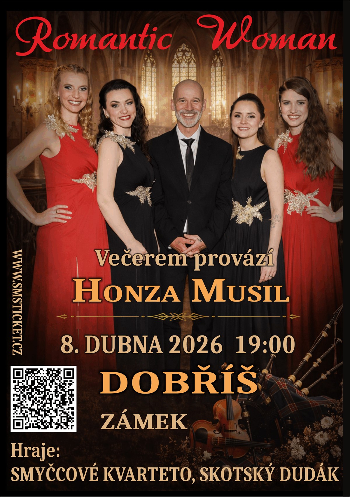 Romantic Woman - originální seskupení zpěvaček vás zve na romantický koncert do jedinečných prostor Zámku Dobříš.Připravené hudební aranže naživo doprovodí smyčcové kvarteto a skotské dudy. V keltském stylu zazní největší světové hity jako Amazing Grace, My Heart Will Go On, Loch Lomond, Nella Fantasia a mnoho dalších.Zpívají: Monika Sommerová, Veronika Vršecká, Jana Štěpánková a Barbora JanskáVečerem provází moderátor Honza MusilTvorba Romantic Woman je inspirovaná světově proslulým irským vokálním projektem Celtic Woman.