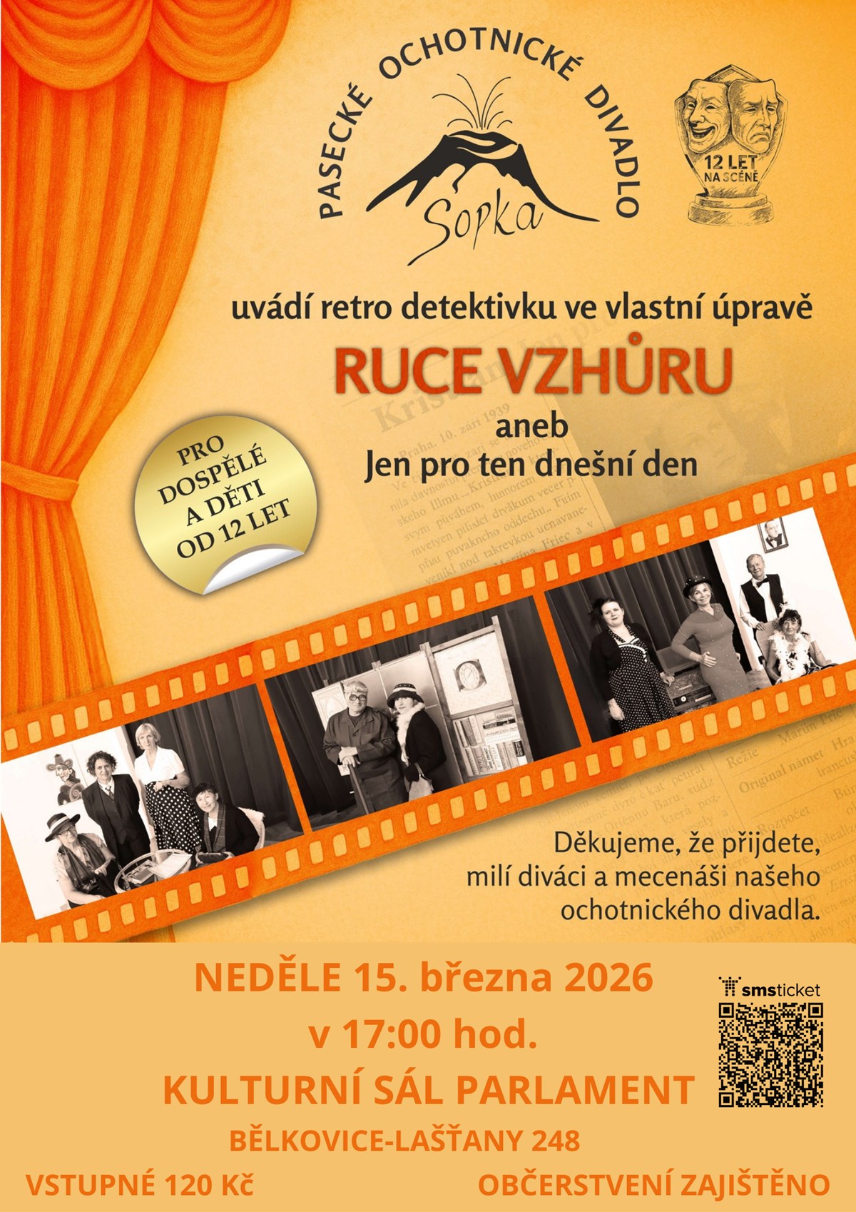 Pasecké ochotnické divadlo SOPKA uvádí retro detektivku ve vlastní úpravě. Divadelní kus je pro dospělé a děti od 12 let. V neděli 15.03.2026 od 17 hodin v kulturním sále Parlament se na Vás budeme těšit. Občerstvení na místě zajišěno, stejně tak prodej vstupenek.