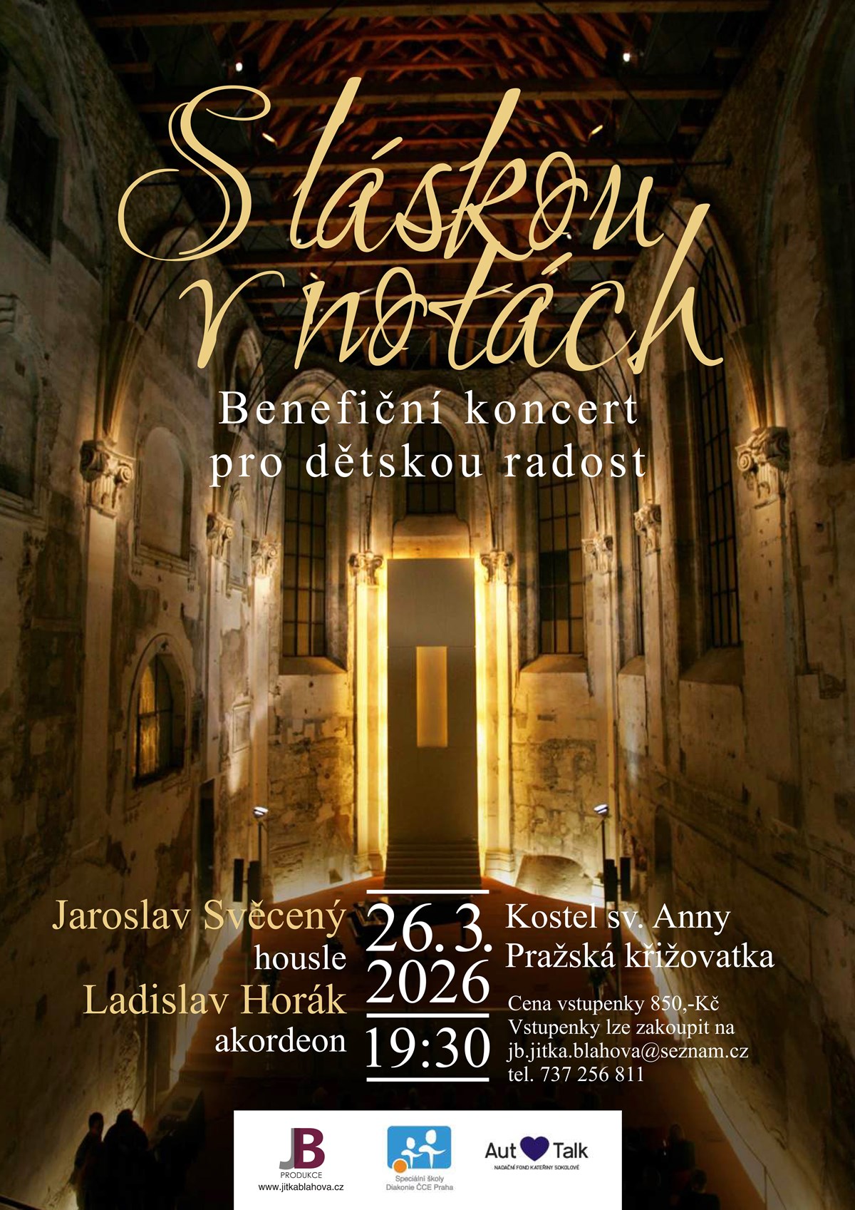 2. ročník benefičního koncertu pro dětskou radost s názvem „S láskou v notách“.Koncert proběhne dne 26.3 2026 ve výjimečných prostorách bývalého kostelasv. Anny, dnes Pražská křižovatka.Tento večer bude opět věnován mateřské a základní škole speciální Diakonie, která pomáhá dětem s různým druhem mentálního postižení a autismem.Výtěžek z tohoto večera půjde na podporu tohoto zařízení.Rádi bychom tento večer pojali nejenom jako koncert, ale zároveň jako přátelské setkání s vámi se všemi. Dveře tohoto výjimečného kostela se pro vás otevřou už hodinu před koncertem, abychom si mohli společně popovídat při sklence dobrého vína, dobré kávy a organických šťáv BUMBEJ. Zároveň budete mít i dostatečný čas na to si v klidu tento jedinečný prostor prohlédnout.