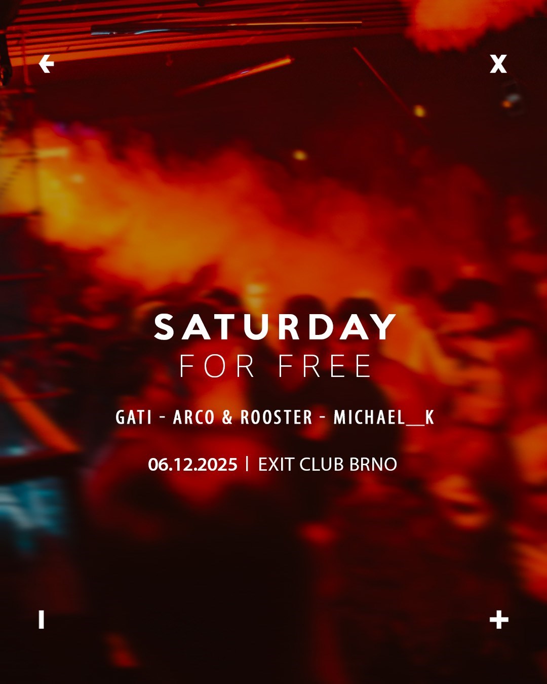 První prosincová sobota v EXIT Club Brno!Čeká vás čtveřice DJs a noc plná house & tech-house.A to nejlepší? Po zakoupení barového voucheru v hodnotě 100 Kč máte vstup zdarma! Pro vstup na akci zdarma si stačí v síti smsticket zakoupit barový voucher v hodnotě 100 Kč ▌Saturday For Free▌Sat. 6.12.2025▌Exit Club Brno (nám. Svobody 17)▌Start 22:00▌Vstup v předprodeji zdarma (stačí zakoupit barový voucher)▌Na místě 150 KčL̶i̶n̶e̶-̶u̶p̶:̶GatiArco & RoosterMichael__K