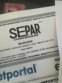 Prodám dvě vstupenky na Separa 10.10 2025 v Bratislavě původní cena 60€