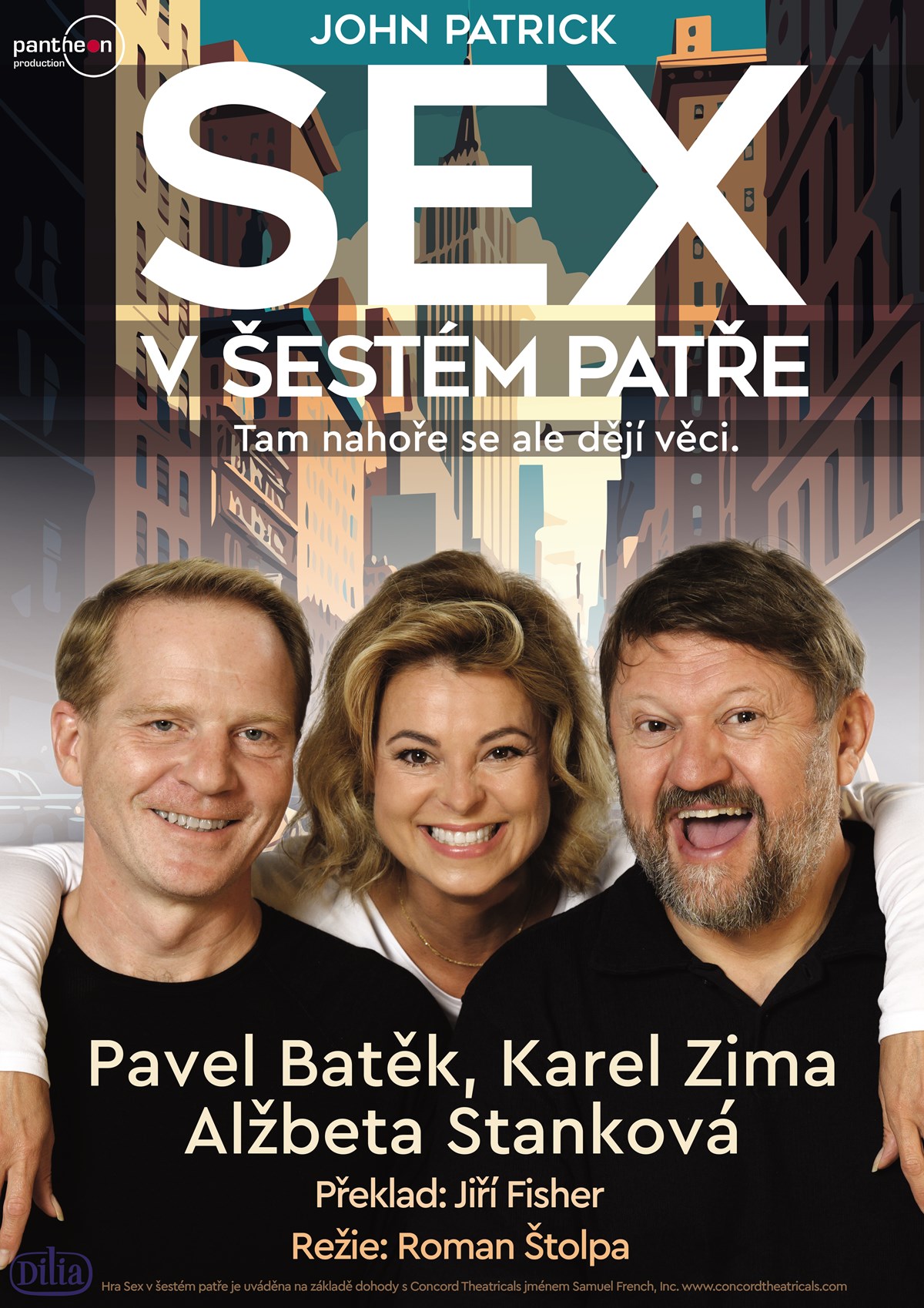Komediální klenot, který patří k nejosvědčenějším titulům světového repertoáru. Činžovní dům v New Yorku, tři prakticky totožné byty v šestém patře, tři na sobě nezávislé příběhy... Anebo je to jen zdání – z této nenápadné situace se rodí lavina nedorozumění, žárlivých scén, flirtů a pikantních dobrodružství. „Sex v šestém patře“ je hra, která už desetiletí baví diváky svou lehkostí, brilantními dialogy a neodolatelným šarmem. Vtipná, jiskřivá a oddechová podívaná, která nikdy nezklame – publikum odchází se smíchem a s pocitem, že život může být plný překvapení.Autorem hry je John Patrick (1905–1995) – jeden z nejvýznamnějších amerických dramatiků a scenáristů 20. století. Jeho dílo získalo nejvyšší ocenění světového filmu i divadla: v roce 1954 obdržel Oscara za nejlepší adaptovaný scénář k filmu „The Teahouse of the August Moon“ (Čajovna Augustového měsíce) a zároveň je držitelem Pulitzerovy ceny. Patrick byl mistrem situační komedie a dialogu, který v sobě spojuje inteligenci, ironii i lidskost. „Sex v šestém patře“ patří mezi jeho nejslavnější hry a potvrzuje jeho schopnost psát texty, které baví široké publikum napříč generacemi.Hrají: Karel Zima, Pavel Batěk a Alžbeta Stanková