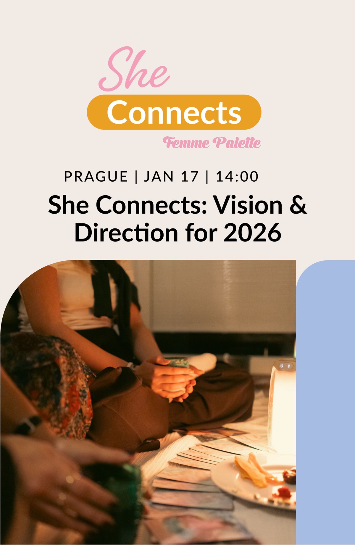 She Connects: Vision & Direction for 2026An intentional afternoon of reflection, release, and aligned planningLet’s make this January about choosing direction with clarity, rather than chasing after random new years resolutions and join us for a 2.5-hour guided She Connects workshop designed to help you gently close 2025 and step into 2026 feeling aligned and intentional with other fellow Femme Palette women.This intimate event is your space to pause and reconnect with what truly matters to you — personally and professionally.Through a mix of female circle practices, meditation, journaling, and structured annual planning, we’ll work on:Releasing anxiety, tension and pattern that no longer serve you Gaining clarity on what you want to invite into 2026 Setting meaningful intentions for your personal life Defining professional development goals that support your growth (not KPIs or company targets) Expect a calm, supportive atmosphere with tea, nourishing snacks, and thoughtful guidance. A space to let go, dream again, and create a plan that feels aligned with your inner self.This is not about doing more. It’s about choosing intention, clarity, and self-trust.This workshop will be led by Valeria from our Femme Palette Community. For the past seven years, she has guided women through healing, connection, and self-discovery as a transformational coach and facilitator of cacao ceremonies and women’s circles. Her work is rooted in care, empathy, and the gentle power of presence. Valeria creates a space free of judgment or competition, where growth is celebrated and authenticity is welcomed. Time: Saturday, January 20th from 14:00-17:00Price: 500 CZKVenue: Atma, Vítkova 241/10, 186 00 Praha 8-Karlín, Czechia