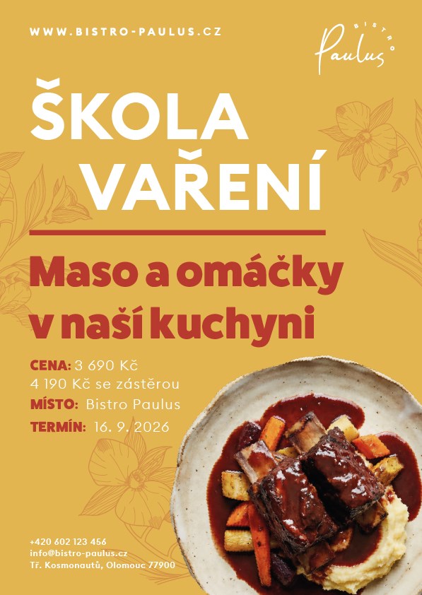 Vítejte ve škole vaření s Romanem Paulusem!Tentokrát se v kurzu vaření zaměříme na maso a omáčky.Můžete se těšit na Striploin steak s omáčkou Bearnaise a pepřovou omáčkou, kuřecí prsa sous vide s houbovou omáčkou, dančí kýtu na smetaně, hrnečkový knedlík a nakonec vaječný sabayone s lesními plody.Rádi připravujete maso? Nebo prostě máte rádi dobré jídlo? Právě pro vás jsme připravili kurz vaření, kde vás naučíme, jak připravit dobrou omáčku a jak správně zpracovat maso.V kurzu se pod vedením michelinského šéfa Romana Pauluse naučíte připravit výtečné 5-chodové menu. Kromě příjemně strávených chvil u plotny si odnesete i spoustu užitečných praktických znalostí, krásných zážitků, sadu receptů a podepsaný certifikát. O alko a nealko režim bude po celou dobu postaráno.Kurzy probíhají od 17 do 21 hodin v malých skupinkách a díky tomu budete mít plnou pozornost našich šéfů. Těšíme se na vás ve stylových prostorách Bistro PaulusPartnerem školy vaření s Romanem Paulusem je Tescoma.---- Na akci může být pořizován obrazový záznam pro marketingové účely. Pořízené záznamy můžou být použity zejména na našem webu a sociálních sítích.