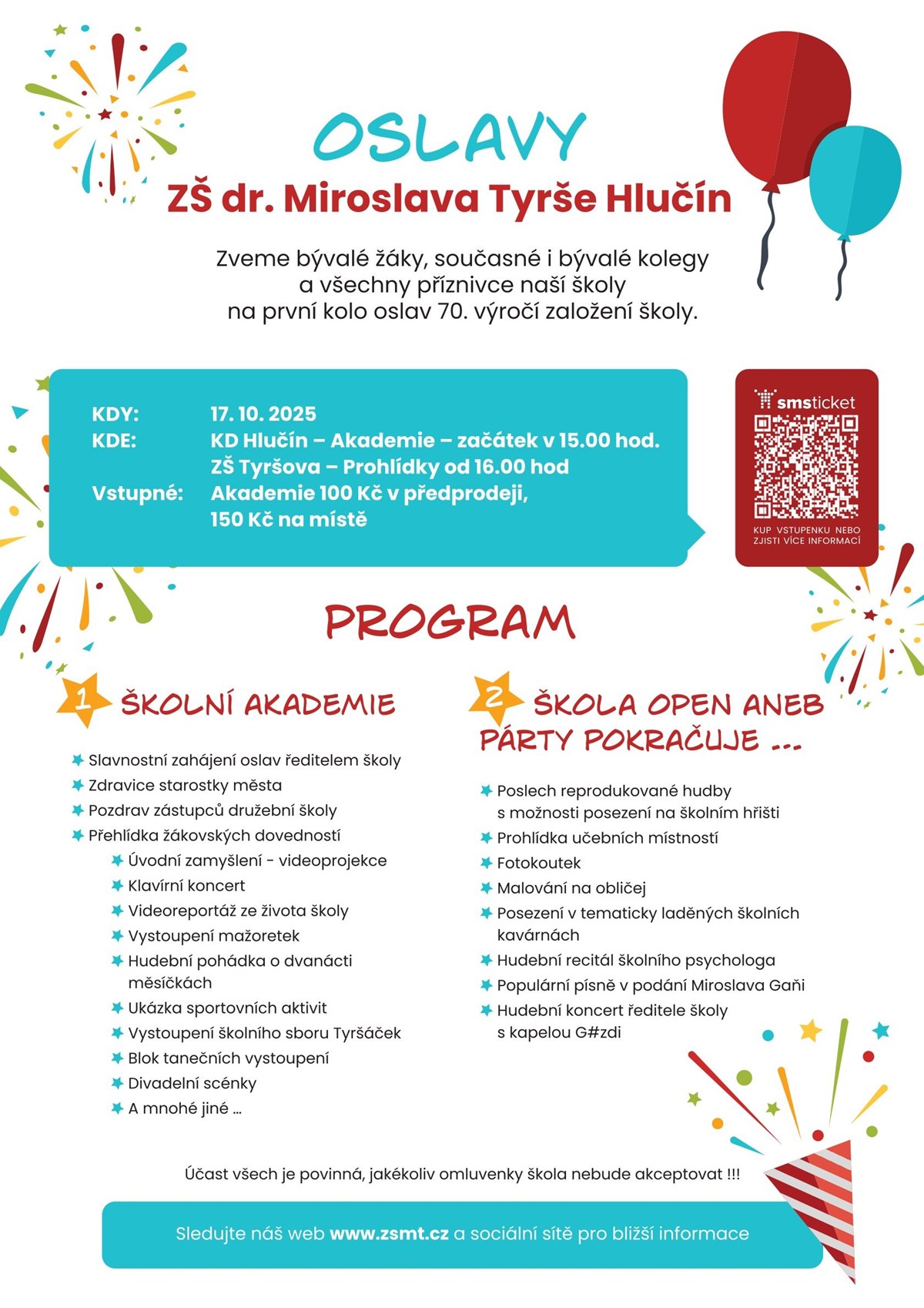 • Slavnostní zahájení oslav ředitelem školy• Zdravice starostky města• Pozdrav zástupců družební školy• Přehlídka žákovských dovedností• Úvodní zamyšlení - videoprojekce• Klavírní koncert• Videoreportáž ze života školy• Vystoupení mažoretek• Hudební pohádka o dvanácti měsíčkách• Ukázka sportovních aktivit• Vystoupení školního sboru Tyršáček• Blok tanečních vystoupení• Divadelní scénky• A mnohé jiné …