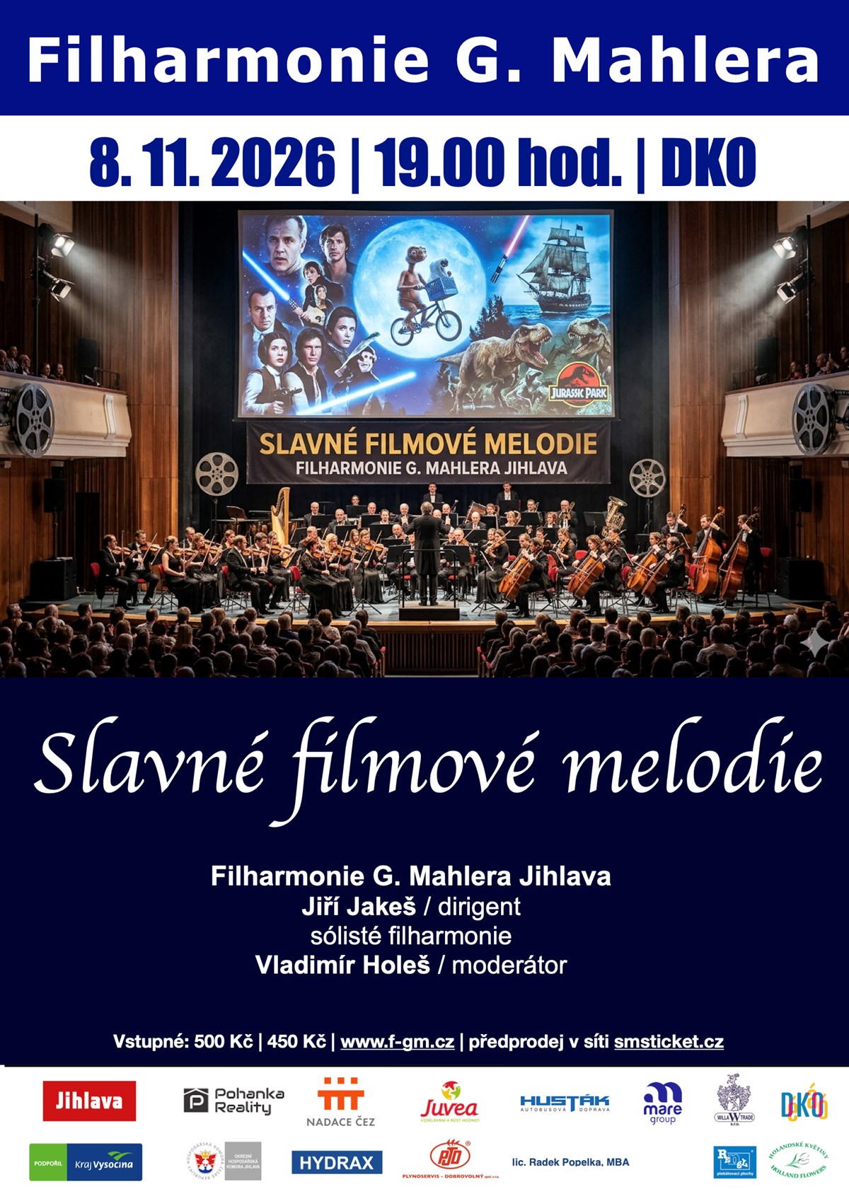 Jeden z nejpopulárnějších koncertů naší filharmonie všech dob! Slavné filmové a muzikálové melodie v úpravě Jiřího Jakeše pro symfonický orchestr.Účinkují:Filharmonie G. Mahlera JihlavaJiří Jakeš - dirigentsólisté filharmonieVladimír Holeš - moderátorKoncert se koná za finanční popory statutárního města Jihlavy a Kraje Vysočina.