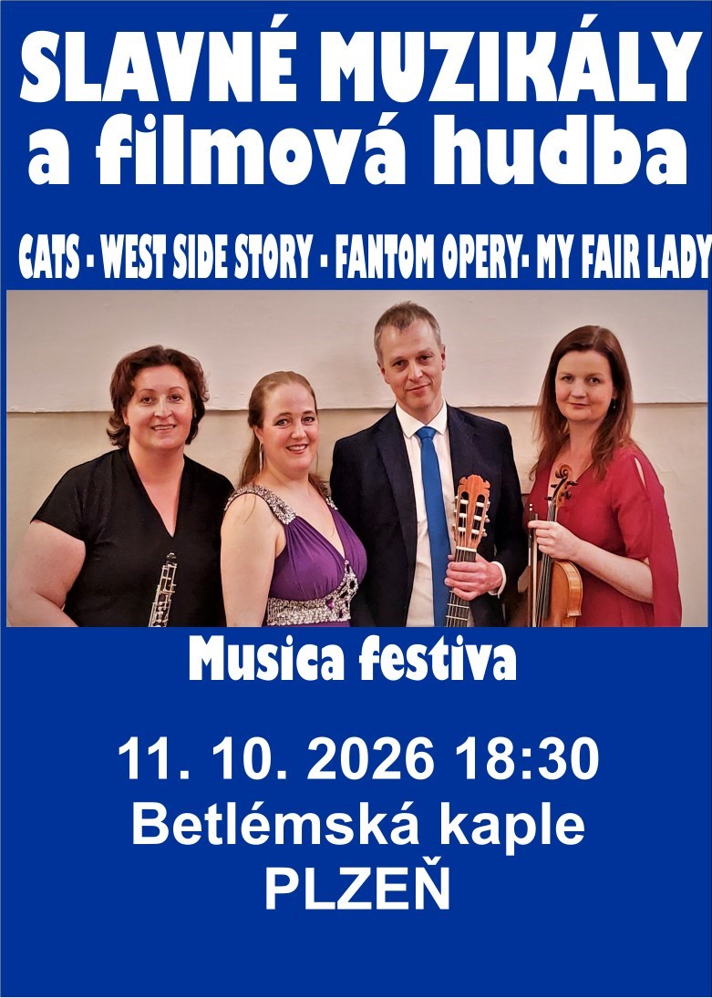 Přijďte si vychutnat do krásného prostředí funkcionalistické Betlémské kaple (vytápěno) nový zajímavý program plný písní ze světových muzikálů doprovázený filmovou hudbou:.MUSICA FESTIVABronislava Smržová – soprán, Šárka Trávníčková – housle, Gabriela Plachá – hoboj, Petr Štěpán - kytara PROGRAM:CATS - A. L. WEBBER: MemoryFANTOM OPERY - A. L. WEBBER: Think of meWEST SIDE STORY - L. BERNSTEIN: I feel prettySNÍDANĚ U TIFFANIHO - H. MANCINI: Moon RiverMY FAIR LADY - F. LOEWE: Chci jen někde svůj plácek mítPORGY A BESS - G. GERSHWIN: Summer Time WEST SIDE STORY - L. BERNSTEIN: TonightJESUS CHRIST SUPERSTAR - A. L. WEBBER: I don´t know how to love him MISE - E. MORRICONE: Gabriel´s OboeJAMES BOND - M. NORMAN: James Bond ThemeMAMMA MIA - B. ANDERSON: I do, I do, I doFORREST GUMP - A. SILVESTRIKMOTR - N. ROTA: The Godfather themeLÁSKA NEBESKÁ - L. ARMSTRONG: Portuguese love themeJAMES BOND - Adele: SkyfallRŮŽOVÝ PANTER - H. MANCINI: Pink PantherPEARL HARBOUR - H. ZIMMER: TennesseeDélka asi 65 minut