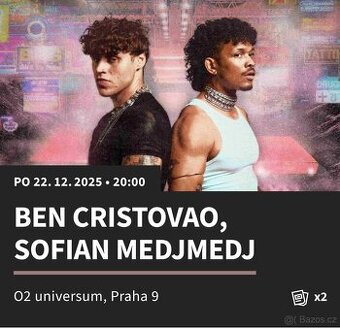 Prodám lístky na Ben Cristovao a Sofian Medjmedj v O2 Universum 22.12.2025 2x stání - cena 2500,-/vstupenka Na ceně je možné se dohodnout Možnost převodu přes Ticketmaster nebo formou PDF.