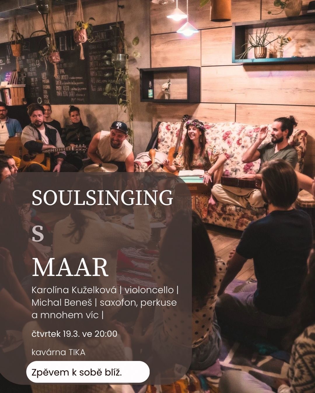 Zpěv, který zvládne každý, který nás přiblíží k sobě a dovede k radosti nebo k dojetí, prostě k prožitku.Cesta, na které zapomenete na své problémy a uvolníte se do přítomnosti.Maar vás naladí písněmi ze všech koutů světa, Kája Kuželková u toho zahraje na violoncello a Michal Beneš na saxofon, perkuse a další.Pro všechny, kdo rádi zpívají i pro ty, kdo se stydí zpívat.Odcházet budete o kousek lehčí než jste přišli.