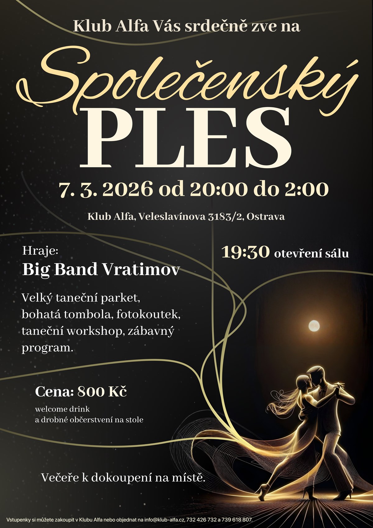 Srdečně Vás zveme na Společenský ples v Klubu Alfa, který se bude konat 7.3.2026.Otevření sálu v 19:30, zahájení plesu ve 20:00, ukončení ve 02:00.K tanci i poslechu hraje orchestr Big Band Vratimov.Hrajeme bez přestávek - o přestávce bude hrát reprodukovaná hudba STT a LAT tance.Můžete se těšit na velký taneční parket, bohatou tombolu, taneční workshop, fotokoutek.Přivítáme Vás skleničkou prosecca a na stolech Vás bude čekat drobné občerstvení.Na místě si budete moci zakoupit večeři. Výběr bude ze dvou jídel: 1. Smažený kuřecí řízek, bramborový salát 189Kč2. Hovězí guláš, chléb, cibule 189KčMůžete si zarezervovat už během koupi vstupenek - uveďte prosím do poznámky, uhradíte poté na baru.