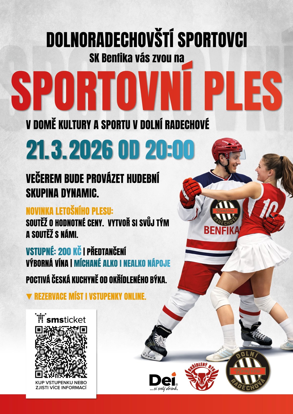 Sportovní ples pořádaný dolnoradechovskými sportovci z SK Benfika Dolní Radechová se uskuteční v sobotu 21. března 2026 v Domě kultury a sportu v Dolní Radechové. Návštěvníci se mohou těšit na skvělou hudbu, výborná vína, míchané alko i nealko nápoje a poctivou českou kuchyni od Okřídleného Býka. Večerem bude provázet hudební skupina Dynamic, která zahraje k tanci i poslechu. Akce začíná ve 20:00. Novinkou letošního plesu je soutěž o hodnotné ceny – vytvořte si svůj tým a zapojte se do soutěžení. Vstupné činí 200 Kč, součástí programu je také předtančení. Rezervace míst i prodej vstupenek probíhá online.Vstupem na tuto akci udělujete souhlas s tím, že mohou být pořízeny videozáznamy či fotodokumentace Vaší osoby, které mohou být zveřejněny na webových stránkách, sociálních sítích a v propagačních materiálech SK Benfika Dolní Radechová a Obce Dolní Radechová.