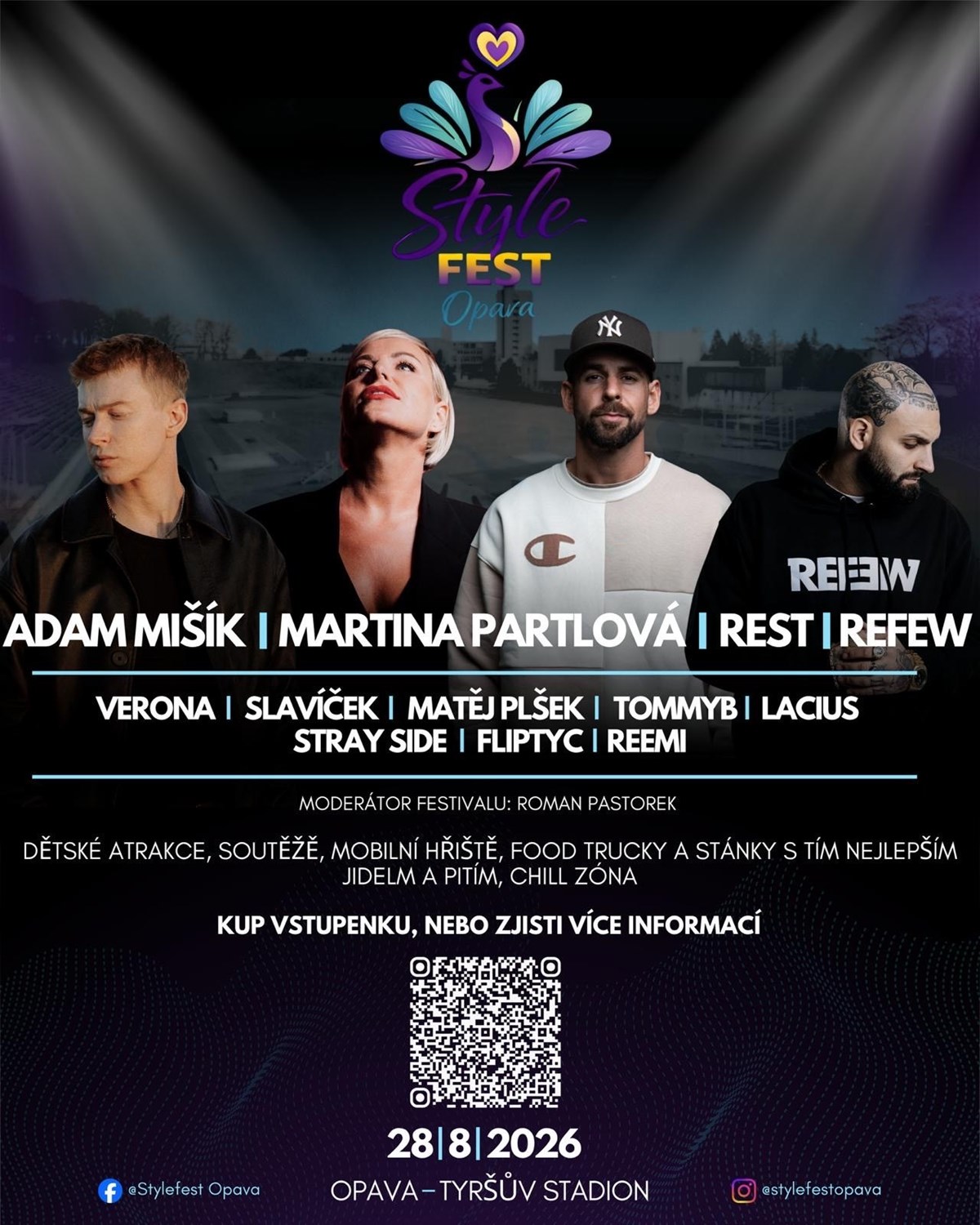 StyleFest Opava Openkdy: 28.8.2026čas : od 11:00 hodKde: Tyřšův Stadión v Opavě Rodinný festival plný zábavy , hudby a stylové ukončení léta!Zveme Vás na jedinečný StyleFest Opava který se uskuteční na legandarním místě a to na Tyršovém stadiónu. Čeká Vas den nabity energií , radosti a programem pro všechny generace.Festival je určen pro děti a dospělé - těšit se můžete na dětskou zónu, soutěže , kreslení na obličej , atrakce, kolotoče , mobilní hříště atd. Pro děti vše zdarma.Gastro zóna - jídlo , pití , alko, food truck, gril, atd. Martina PártlováEnergická česká zpěvačka s nezaměnitelným hlasem a přirozeným charismatem. Martina Pártlová je známá svou pozitivní energií, smyslem pro humor a silným vokálním projevem, který dokáže roztančit i dojmout publikum všech generací.Do povědomí se dostala jako členka dívčí skupiny 2Hermanas a později se vydala na úspěšnou sólovou dráhu. Její vystoupení jsou plná emocí, kontaktu s publikem a skvělé atmosféry.Na pódiu vás čeká show plná oblíbených hitů, energie a dobré nálady, která rozezpívá celý areál. Rapper Rest – energie, flow a mladá krevRapper Rest přináší na Stylefest moderní hudební vibe, silné texty a energii, která rozhýbe celý areál. Jeho tvorba spojuje současný rapový zvuk s autentickým projevem a kontaktem s publikem.dynamická show plná rytmuvlastní tvorba i známé trackymoderní beaty a festivalová atmosféraPřipravte se na vystoupení, které zvedne náladu, roztleská dav a přinese na pódium pořádnou dávku energie. RefewRefew patří mezi výrazné tváře české rapové scény. Je známý svou autentickou tvorbou, osobními texty a energickým projevem, který dokáže strhnout publikum během pár vteřin. Ve své hudbě kombinuje moderní beaty s upřímnými tématy ze života, vztahů i každodenní reality.silná energie a kontakt s publikemznámé tracky i novější tvorbamoderní zvuk a výrazný flowNa pódiu přináší show plnou emocí, rytmu a atmosféry, která rozhýbe celý festival. Adam MišíkAdam Mišík je výrazná osobnost české hudební scény – zpěvák, skladatel i herec s moderním popovým zvukem a charismatickým vystupováním. Jeho hudba spojuje chytlavé melodie, současnou produkci a emoce, které si získaly široké publikum napříč generacemi.Proslavil se hity, které pravidelně zaznívají v rádiích i na festivalech, a na pódiu přináší energickou show plnou světel, rytmu a kontaktu s fanoušky.moderní popový soundznámé hity i nová tvorbadynamická festivalová atmosféraPřipravte se na vystoupení, které rozezpívá celý areál a dodá večeru tu pravou energii. VeronaSkupina Verona patří mezi stálice české taneční a popové scény. Je známá svými chytlavými hity, energickými refrény a pozitivní atmosférou, která roztančí publikum všech generací.Jejich hudba spojuje moderní dance-popový zvuk s melodickými linkami a výrazným vokálem. Na pódiu přinášejí show plnou rytmu, světel a festivalové energie.taneční beaty a známé hitysilný vokální projevpozitivní vibe a skvělá atmosféraPřipravte se na vystoupení, které promění festivalový areál v jednu velkou taneční party! Mladý zpěvák SlavíčekTalentovaný mladý interpret, který si získává publikum svým čistým hlasem, přirozeným projevem a upřímnou radostí z hudby. Slavíček přináší na pódium svěží energii, nadšení a atmosféru, která potěší malé i velké posluchače.mladá energie a nadšeníznámé písně i vlastní repertoárbezprostřední kontakt s publikem Jeho vystoupení je plné emocí, radosti a hudebního talentu, který slibuje krásný zážitek pro celou rodinu.Stylové ukončení léta pro celou rodinu.