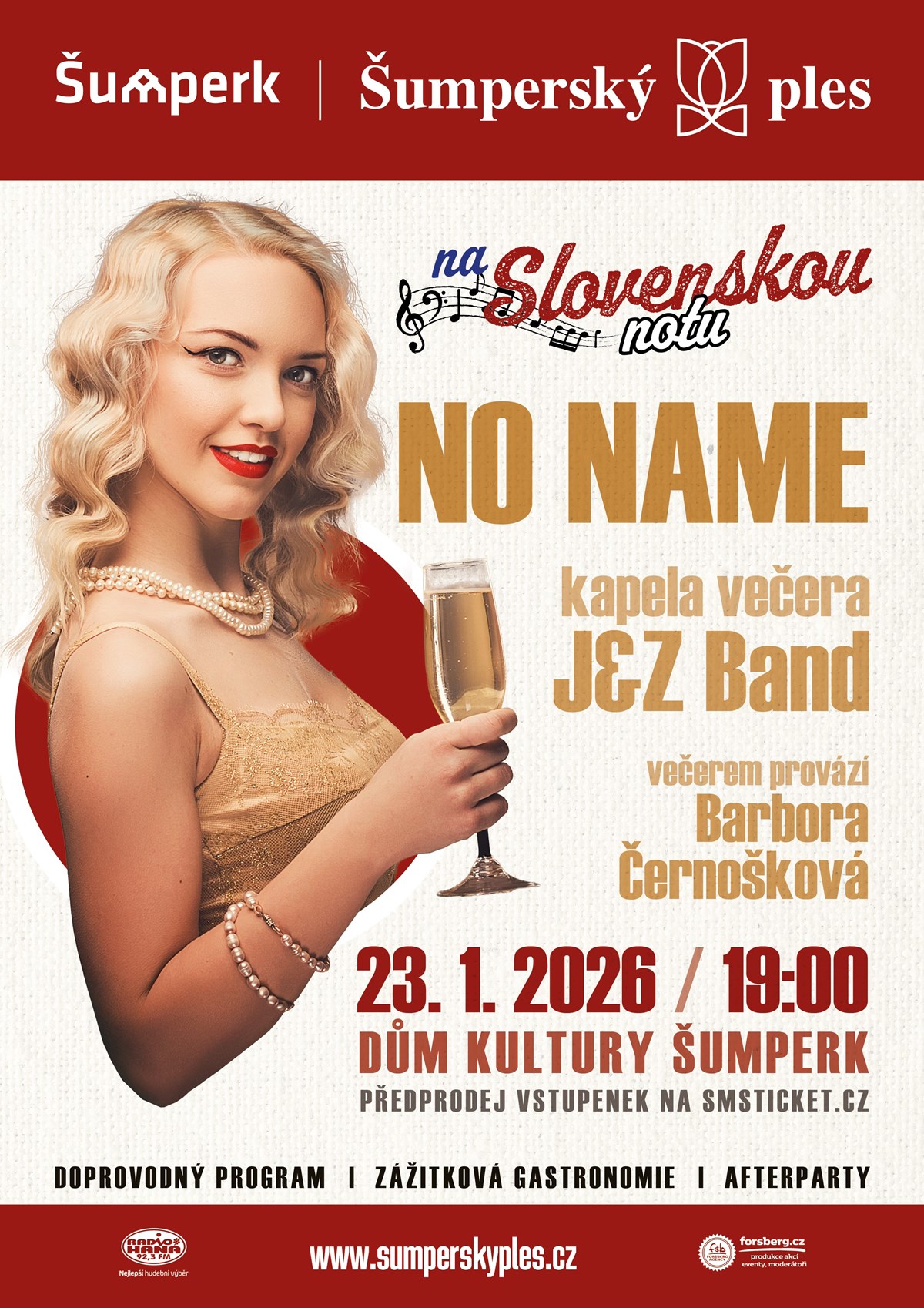 Šumperský ples s podtitulem NA SLOVENSKOU NOTU roztančí Dům kultury 23. ledna 2026. Jedinečný večer v té nejlepší společnosti, se špičkovým programem a občerstvením v ceně vstupenky.Taneční horečku ve vás zažehne brněnský coverband J&Z Band, celým večerem nás bude provázet známá česká novinářka a moderátorka Barbora Černošková a hity jako „Ty a Tvoja sestra“, „Žily“ nebo „Čím to je“ si budete moci zazpívat s našim hvězdným hostem, slovenskou populární hudební skupinou NO NAME.Doprovodný program nabídne originální taneční vystoupení, fotokoutek, soutěž o ceny, ale i mnoho dalšího. O diskotéku a afterparty se postará Radio Haná.Prostory DK se otevřou v 19:00, program na hlavním sále začne v 19:30 a slavnostní zahájení plesu se uskuteční ve 20:00.Cena vstupenky/místenky vč. občerstvení:Velký sál: 890,-KčBalkon a Salonky: 790,-KčNenechte si ujít jeden z vrcholů společenské sezóny! Těšíme se na vás! Akci pro vás připravuje Město Šumperk, Radio Haná a produkční agentura Forsberg.