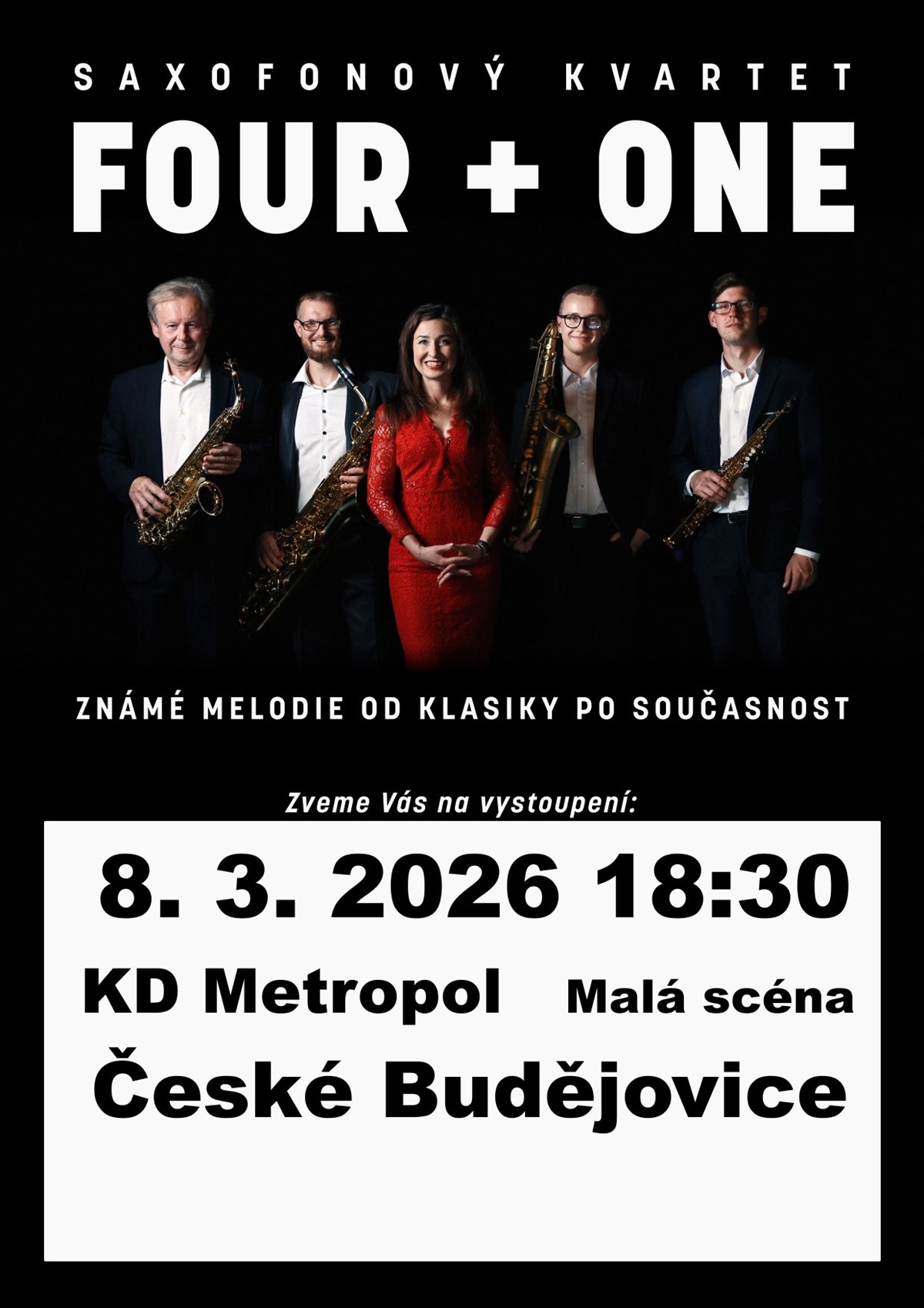 Pojďte si užít zbrusu nový program pro 4 saxofony a zpěv v dramaturgicky pestrém koncertu od klasiky, přes swing a jazz až k moderní hudbě, včetně aranží písniček Beatles do vytápěné Malé scény KD Metropol v Českých Budějovicích Saxofonové kvarteto FOUR + ONEPetr RANDÍK – soprán saxofon, Zdeněk ZADRAŽIL – alt saxofon,Tomáš PUDIVÍTR – tenor saxofon, Vít DĚDIČ – baryton saxofona Andrea KAŇKOVÁ - zpěvPROGRAM:A. VIVALDI - Jaro ze Čtyř ročních období (v úpravě pro saxofony)A. DVOŘÁK - Largo z NovosvětskéE. MORRICONE - Tenkrát na západěJ. KANDER - New York, New YorkL. COHEN - HallelujahJ. JEŽEK - Bugatti StepG. GERSHWIN - I got rhytmBEATLES - Eleanor RigbyBEATLES - IMAGINEBEATLES - Can´t buy me loveQUEEN - Crazy Little Think Called LoveB. STREISAND - MEMORYW. HOUSTON - I will always love youB. STREISAND - Tell HimB. LISTON - BrazilB. Mc FERRIN - Don´t Worry Be HappyF. SINATRA - My Wayzměna programu a účinkujících vyhrazena, délka cca 65 minut