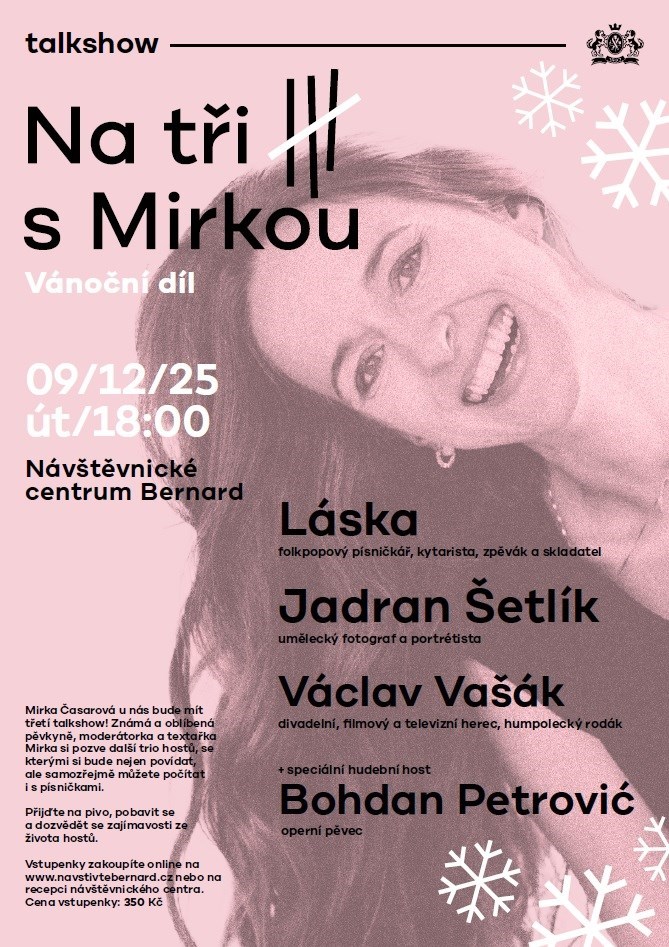 Mirka Časarová u nás bude mít třetí talkshow! Známá a oblíbená pěvkyně, moderátorka a textařka Mirka si pozve další trio hostů, se kterými si bude nejen povídat, ale samozřejmě můžete počítat i s písničkami.Přijďte na pivo, pobavit se a dozvědět se zajímavosti ze života hostů.Vstupenky zakoupíte online nebo na recepci návštěvnického centra.Cena vstupenky: 350 KčHosté: Láska (folkpopový písničkář, kytarista, zpěvák a skladatel)Jadran Šetlík (umělecký fotograf a portrétista)Václav Vašák (divadelní, filmový a televizní herec, humpolecký rodák)+ speciální hudební host Bohdan Petrović (operní pěvec)