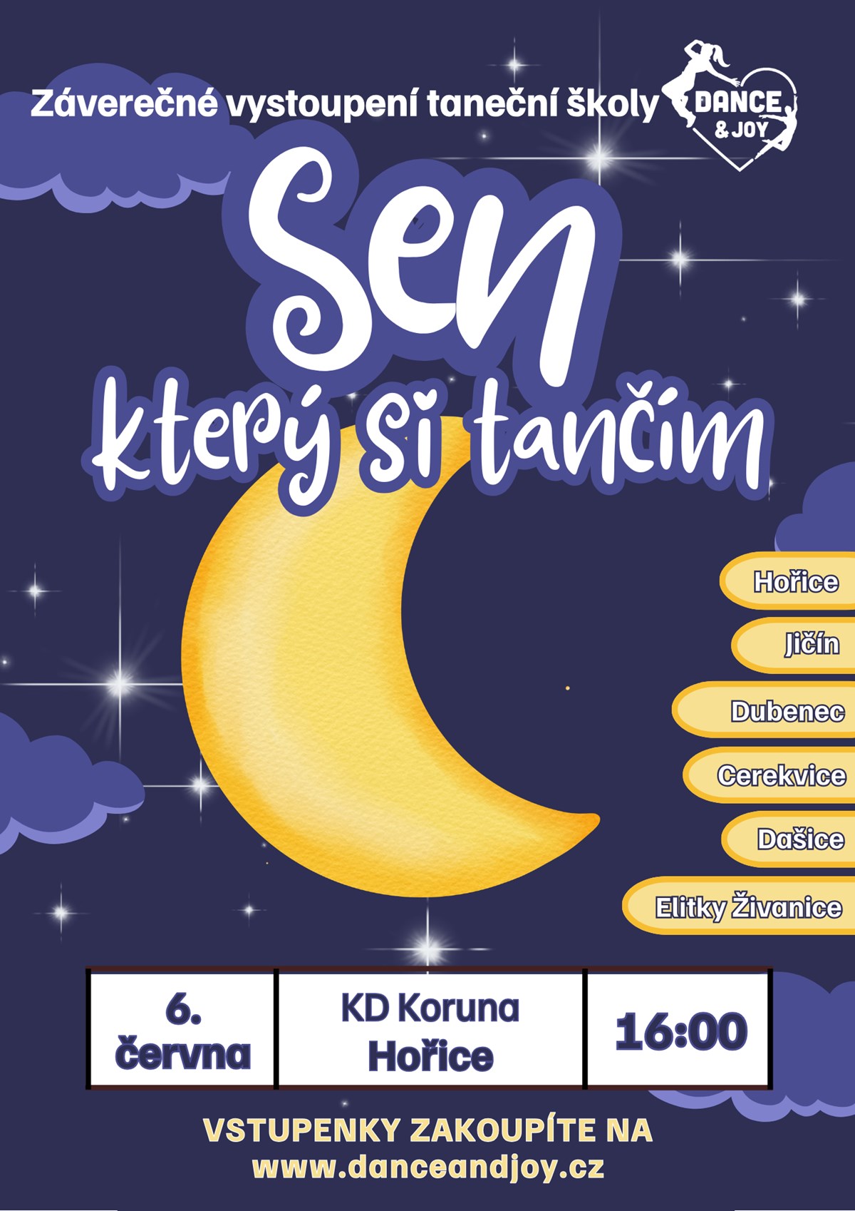 Závěrečné vystoupení taneční školy Dance & JoySen, který si tančímZveme vás na pravidelné závěrečné vystoupení taneční školy Dance & Joy s názvem "Sen, který si tančím". Přijďte si užít jedinečné taneční odpoledne plné emocí, radosti a pohybu.Na pódiu se představí tanečníci z těchto měst a obcí:Hořice, Elitky Hořice, Jičín, Dubenec, Cerekvice, Dašice a Elitky Živanice.📅 6. června📍 KD Koruna, Hořice🕓 Začátek v 16:00Těšíme se na vaši návštěvu a společný taneční zážitek.