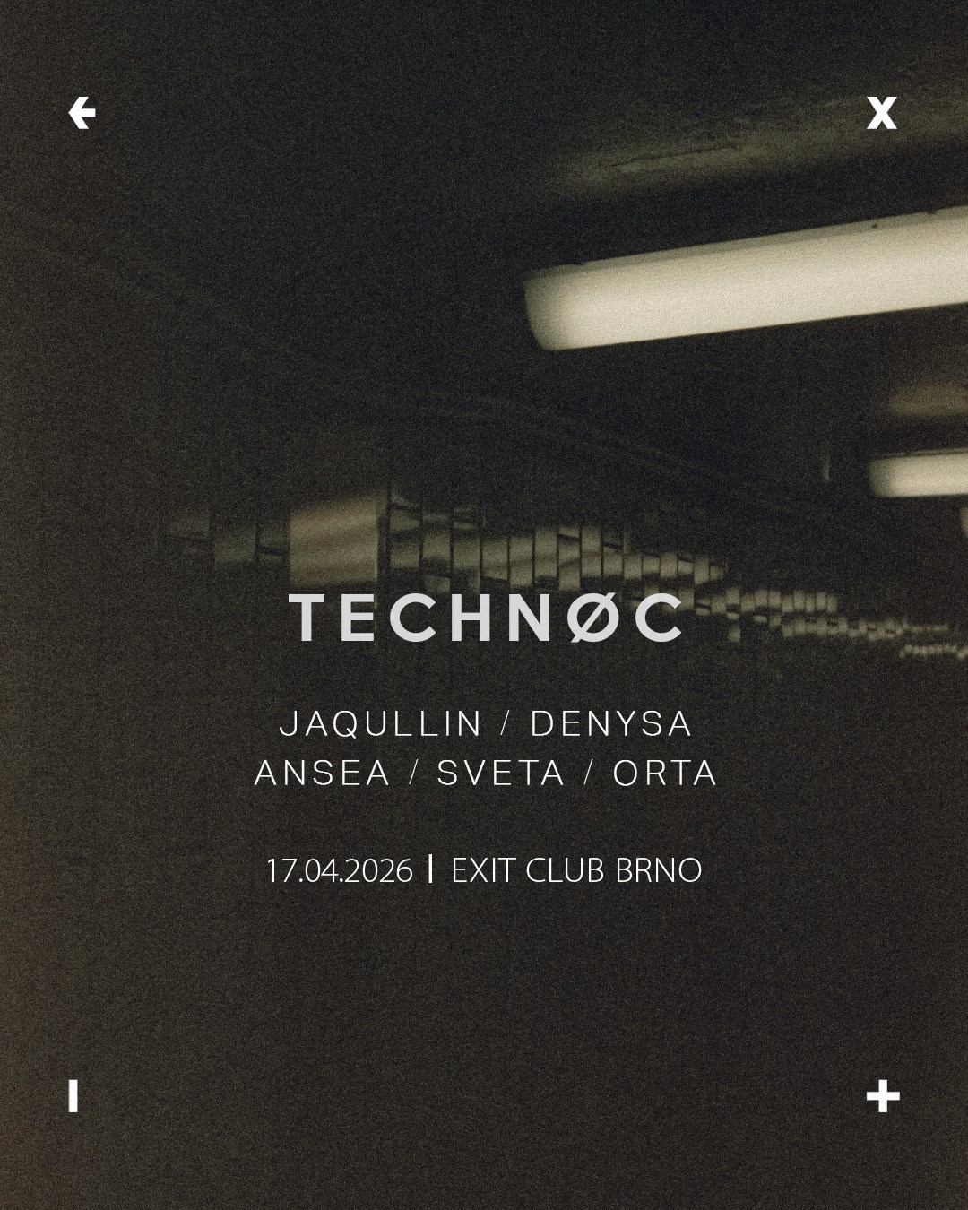 DJ 𝐉𝐚𝐪𝐮𝐥𝐥𝐢𝐧 a její rezidentní 𝐓𝐄𝐂𝐇𝐍Ø𝐂 hlásí na 17.4. v Exitu pokračování! Tentokrát se bude servírovat techno v ryze ženském podání. Vstupenky:Happy Hour Ticket - 75 Kč (Vstup na akci podmíněn mezi 22:00 - 23:00)Standard Ticket - 150 KčTECHNØCFri. 17.4.2026EXIT Club BrnoStart 22:00L̶i̶n̶e̶-̶u̶p̶:̶JaqullinDenysaAnseaSvetaOrta