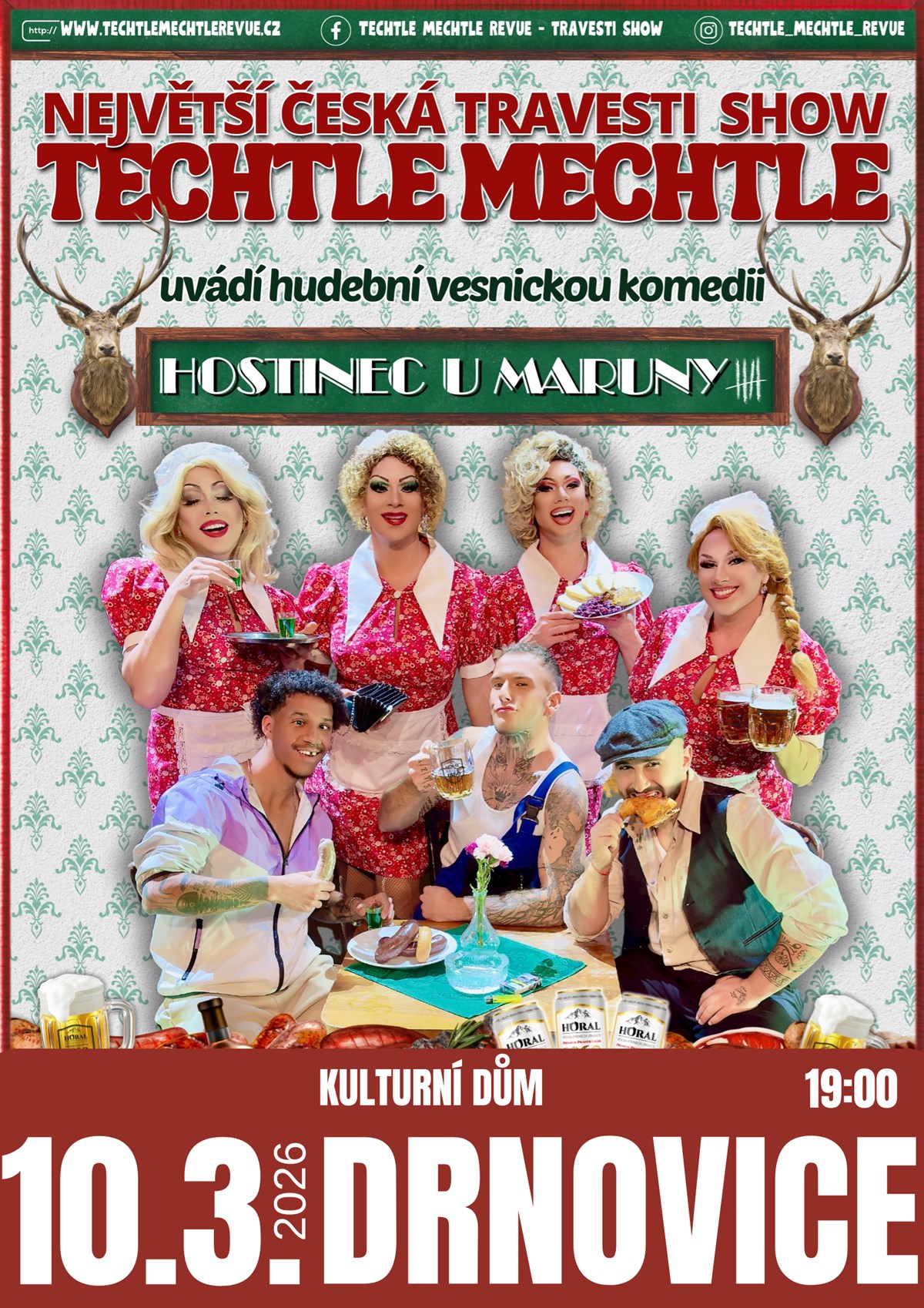 Největší česká travesti show Techtle Mechtle přiváží novou divadelní komedii HOSTINEC U MARUNY Techtle Mechtle revue je v současné době nejúspěšnější česká show na poli divadelní scény. V podání Techtle Mechtle se vždy jedná o propracované divadelní představení s výpravnou scénou a více jak 80-ti kostýmy. Všechna představení jsou jednou velkou komedií, a to od začátku až do konce.Má to jen jeden háček - všechny role, a to včetně těch dámských, tu hrají pouze muži a ti jsou navíc k nerozeznání od skutečných žen. Pánové Lukáš, Martin, Nikolas a Jarek společně s tanečníky Štěpánem, Sayem a Danem pro Vás tentokrát připravili další bláznivou komedii z prostředí české vesnické hospody.Rázná hospodská Maruna, která má nejen celý svůj hostinec, ale také všechny svoje štamgasty pod palcem a k tomu příběhy, které píše sám život. Co všechno se dá zažít v jedné vesnické hospůdce během přípravy hasičského plesu, to uvidíte právě v české hudební komedii "Hostinec u Maruny". Chybět nebude pořádná dávka českého humoru, láska, hospodská rvačka a pivo poteče jak jinak než proudem. Samozřejmě zazní během večera české hospodské písničky, které si budete broukat ještě na cestě domů a i celý druhý den...Všechna představení jsou vlastní autorskou tvorbou pánů z Techtle Mechtle revue, a to od scénáře, přes dialogy, hudbu, návrhy scény i kostýmů. Nenechte si ujít strhující hudební představení v podání nejúspěšnějších českých travesti umělců a jejich tanečníků.