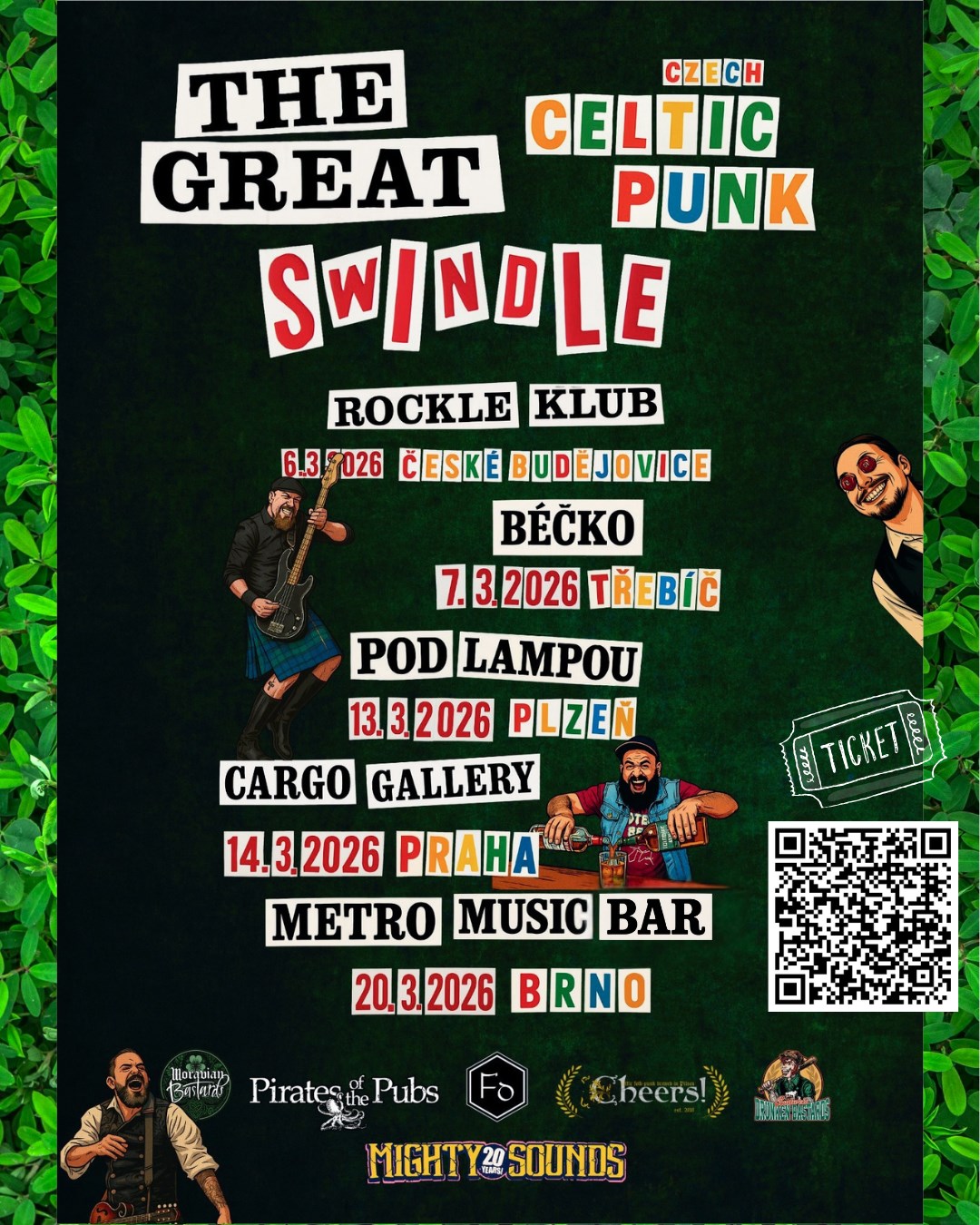 Společné turné toho nejlepšího, co česká celtic punková scéna nabízí. Pět měst, pět kapel, třicet pět muzikantů, jeden nezapomenutelný zážitek, který už se nebude nikdy opakovat. Celé toto svatopatrické tour se koná na oslavu ... to se už brzy dozvíte.Pirates of the PubsJihočeská parta punkových pirátů brázdí česká ale i evropská moře už 13 let a řadí se mezi nejlepší formace, které tento žánr nabízí.Námořnické popěvky o lákavých dálkách, rumu a pokladech nedozírné ceny vás vtáhnou do dob, kdy se po širých oceánech plavili ty nejslavnější ze všech pirátů, drancířů a bukanýrů.Jejich energické rockové hudbě opepřené melodickými nástroji jako jsou mandolína, housle, akordeon nebo třeba irská flétna nelze odolat a proto se připravte na večírek, který potrvá až do kuropění!Vítr do plachet!České BudějoviceCheers!Šestičlenná parta hrající výhradně vlastní tvorbu. Každý koncert bereme naplno, žádné pozlátko, jen poctivá energie. Texty jsou naše, muzika taky.Naše místo je na pódiu – ale jsme rádi, když ho sdílíš s námi zespoda.PlzeňFoggy DudeNezdravá glorifikace alkoholu, obzvlášť piva a whiskey!Irskej folk, protože housle, mandolína a akordeon; punk, protože se ně snažíme hrát!Texty plný epickejch smyšlenejch příběhů a neznámejch hospod!Punková kapela BEZ TETOVÁNÍ!To vše, a mnohem méně lze zažít pouze na koncertech Foggy Dude!PrahaMoravian BastardsHrajeme celtic punk rock...a taky na dudy!We are Bastards, MORAVIAN BASTARDS!TřebíčBudweis Drunken BastardsSvižnej punk rock navlečenej do kiltu, říznutej harmonikou, akustickou kytarou a litrama alkoholu.České Budějovice