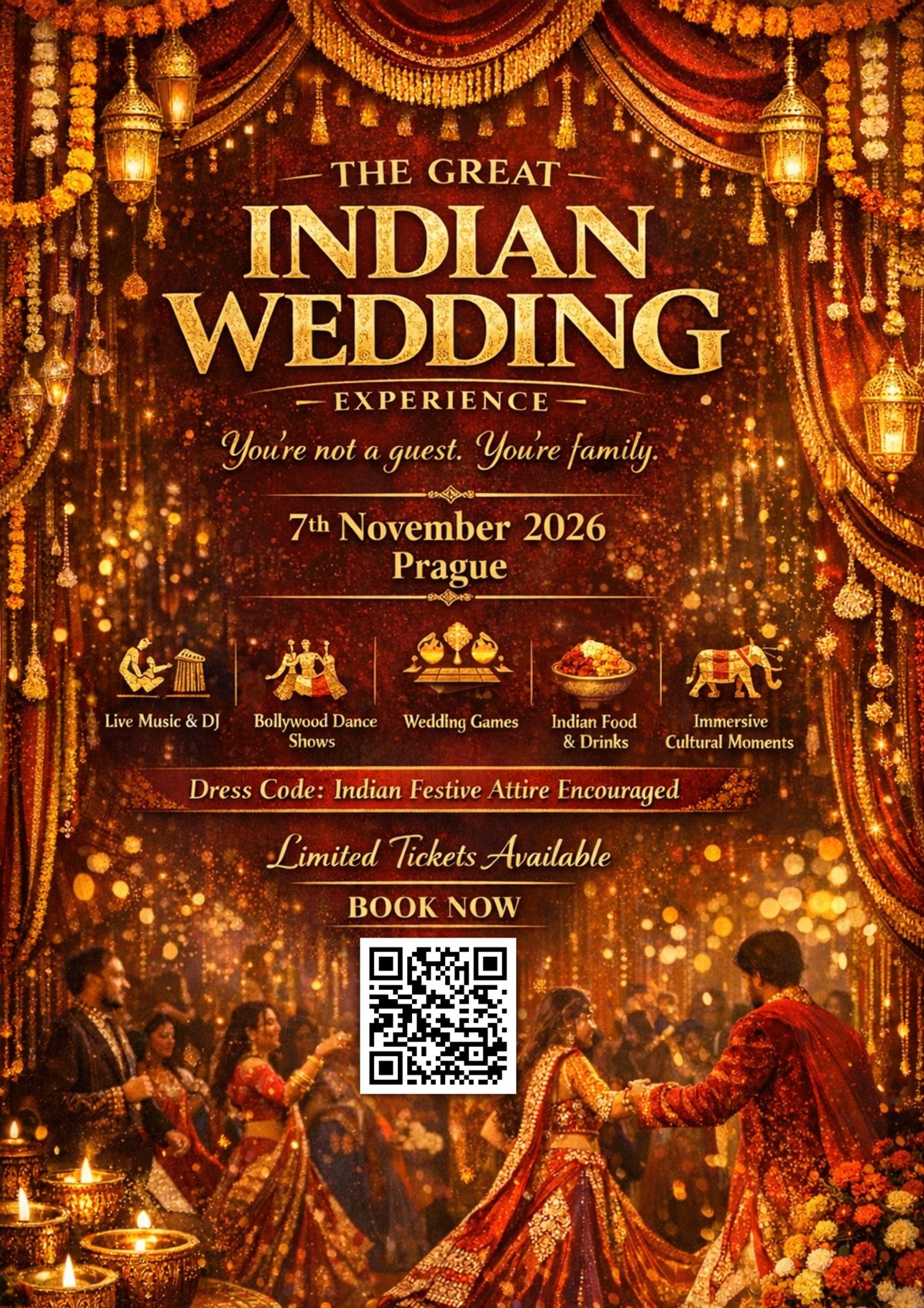 The Great Indian Wedding ExperiencePraha | 7. listopadu 2026 | 19:00–24:00Veškerá radost z indické svatby.Žádné povinnosti.Už jste někdy viděli indickou svatbu?Ty barvy, ten chaos, tanec, hudbu, emoce…A napadlo vás:„Tohle bych chtěl/a zažít alespoň jednou.“Teď máte příležitost!O co se jedná?The Great Indian Wedding Experience je první svého druhu –autentický indo-český zážitek, kde se 150–200 hostů ocitne uvnitř fiktivní indické svatby.Není tu skutečná nevěsta ani ženich.Ale je tu:Strana nevěsty vs. strana ženichasvatební hryrituályhudba a tanecjídlo, drinkya noc, která vás vtáhne tak, že zapomenete na svět kolemNejste jen pozorovatelé.Patříte tam.Co zažijeteslavnostní příchod ve stylu baraat – hudba, barvy, emocerozdělení na Stranu nevěsty nebo Stranu ženicha (ano, soutěží se)ice-breakery, svatební hry a hravé kulturní rituálytaneční souboje, živá vystoupení a DJ partyhenna & momenty ideální na Instagramexkluzivní gastronomický zážitekvelké finále s bohatou svatební tombolouSvatební tombola (ano, můžete vyhrát iPhone)Inspirováno indickou tradicí shagun (šťastné dary) a českou láskou k losování a hrám o štěstí.Každý host je automaticky zapojen.žádné extra registracežádné prodejní řečiprostě přijdete… a necháte rozhodnout štěstí🏆 Hlavní cena: Apple iPhone 16🎁 další prémiové ceny vyhlašované během večeraNěkdo v místnosti určitě vyhraje.A klidně to můžete být vy.Co to NENÍnení to obyčejná partynení to klubová nocnení to kulturní show, kde sedíte a díváte seJe to hlasité, emotivní, hravé a silně sociální.Nejste divák.Jste součástí příběhu.Ideální pro:kulturně zvídavé Evropanyexpaty a mezinárodní komunitu v ČeskuIndy, kterým chybí atmosféra domova(ale už nechtějí nudné „komunitní akce“)páry, přátele i sólo dobrodruhykaždého, kdo dává zážitkům přednost před věcmiKapacita je velmi omezenážádný prodej na místějakmile jsou vstupenky pryč, jsou pryčProč koupit hnedprvní edice = nejvyšší energie a exkluzivitaearly bird ceny se nevrátío tomhle formátu se bude mluvit dlouho předtím, než se zopakujelitovat budete jen jedné věci:že jste to sledovali na Instagramu místo toho, abyste tam byliPoslední otázkaJak často dostanete pozvánku na indickou svatbu…aniž byste museli letět do Indienebo znát nevěstu a ženicha?Přesně tak.👉 Klikněte na „Koupit vstupenky“Oblečte se. Vyberte si stranu.A přijďte slavit------- All the joy of an Indian wedding.None of the obligation.Have you ever seen an Indian wedding?The colours, the chaos, the dancing, the music, the emotions…And thought to yourself:“I wish I could experience this at least once.”Now you can.What is it?The Great Indian Wedding Experience is a first-of-its-kind,authentic Indo-Czech experience where 150–200 guests step inside a fictional Indian wedding.There is no real bride or groom.But there is:Bride Side vs Groom Sidewedding gamesritualsmusic and dancefood and drinksand a night so immersive you’ll forget the world outsideYou’re not just watching.You belong.What you’ll experienceA festive baraat-style entrance – music, colour, emotionAssignment to Bride Side or Groom Side (yes, it’s competitive)Ice-breakers, wedding games & playful cultural ritualsDance-offs, live performances & a DJ-led celebrationHenna & Instagram-worthy momentsAn exclusive gastronomic experienceA grand finale with a luxury wedding raffleWedding Raffle(Yes, you can win an iPhone)Inspired by the Indian tradition of shagun (auspicious gifts) and the Czech love for raffles and games of chance.Every guest is automatically included.no extra registrationno sales pitchesyou just arrive… and let luck decide🏆 Grand Prize: Apple iPhone 16🎁 Additional premium prizes announced throughout the nightSomeone in the room will win.And it could be you.What it is NOTnot a regular partynot a club nightnot a cultural show where you sit and watchIt’s loud, emotional, playful, and deeply social.You are not a spectator.You are part of the story.Perfect forculturally curious Europeansexpats and the international community in CzechiaIndians missing the feeling of home(but done with boring “community events”)couples, friends, and solo adventurersanyone who values experiences over thingsCapacity is extremely limitedno ticket sales at the dooronce tickets are gone, they’re goneWhy buy nowfirst edition = highest energy and exclusivityearly bird prices will not returnthis format will be talked about long before it’s repeatedYou’ll regret only one thing:watching it on Instagram instead of being there.Final questionHow often do you get invited to an Indian wedding…without flying to Indiaor knowing the bride and groom?Exactly.👉 Click “Buy Tickets”Dress up. Pick a side.And come celebrate.