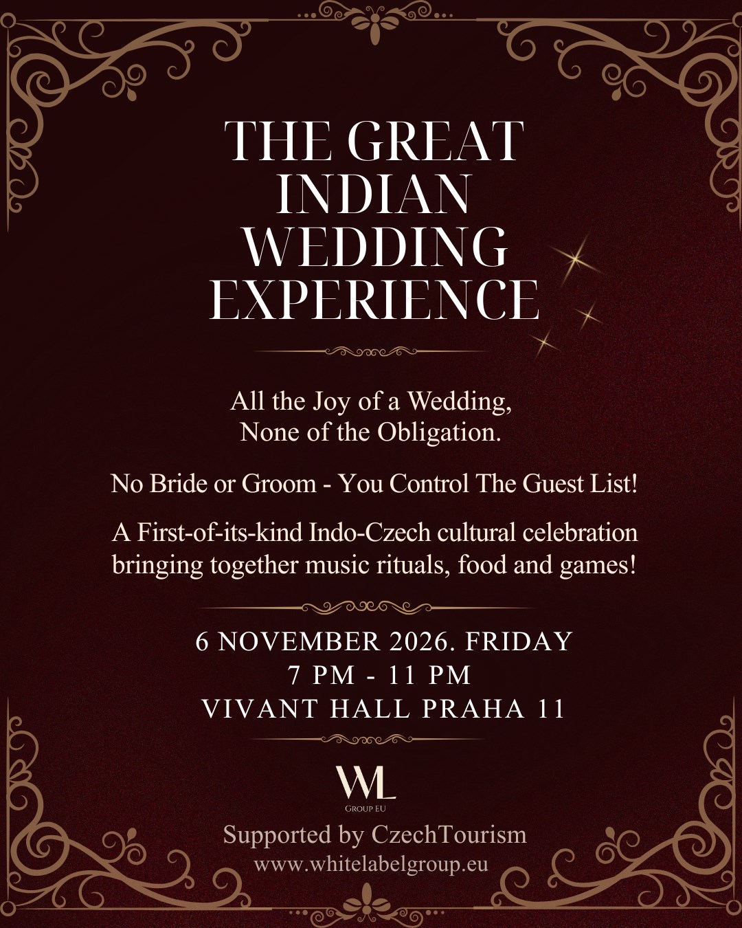 The Great Indian Wedding ExperiencePraha | 6. listopadu 2026 | 19:00–24:00Veškerá radost z indické svatby.Žádné povinnosti.Už jste někdy viděli indickou svatbu?Ty barvy, ten chaos, tanec, hudbu, emoce…A napadlo vás:„Tohle bych chtěl/a zažít alespoň jednou.“Teď máte příležitost!O co se jedná?The Great Indian Wedding Experience je první svého druhu –autentický indo-český zážitek, kde se 150–200 hostů ocitne uvnitř fiktivní indické svatby.Není tu skutečná nevěsta ani ženich.Ale je tu:Strana nevěsty vs. strana ženichasvatební hryrituályhudba a tanecjídlo, drinkya noc, která vás vtáhne tak, že zapomenete na svět kolemNejste jen pozorovatelé.Patříte tam.Co zažijeteslavnostní příchod ve stylu baraat – hudba, barvy, emocerozdělení na Stranu nevěsty nebo Stranu ženicha (ano, soutěží se)ice-breakery, svatební hry a hravé kulturní rituálytaneční souboje, živá vystoupení a DJ partyhenna & momenty ideální na Instagramexkluzivní gastronomický zážitekvelké finále s bohatou svatební tombolouSvatební tombola (ano, můžete vyhrát iPhone)Inspirováno indickou tradicí shagun (šťastné dary) a českou láskou k losování a hrám o štěstí.Každý host je automaticky zapojen.žádné extra registracežádné prodejní řečiprostě přijdete… a necháte rozhodnout štěstí🏆 Hlavní cena: Apple iPhone 17 Pro🎁 další prémiové ceny vyhlašované během večeraNěkdo v místnosti určitě vyhraje.A klidně to můžete být vy.Co to NENÍnení to obyčejná partynení to klubová nocnení to kulturní show, kde sedíte a díváte seJe to hlasité, emotivní, hravé a silně sociální.Nejste divák.Jste součástí příběhu.Ideální pro:kulturně zvídavé Evropanyexpaty a mezinárodní komunitu v ČeskuIndy, kterým chybí atmosféra domova(ale už nechtějí nudné „komunitní akce“)páry, přátele i sólo dobrodruhykaždého, kdo dává zážitkům přednost před věcmiKapacita je velmi omezenážádný prodej na místějakmile jsou vstupenky pryč, jsou pryčProč koupit hnedprvní edice = nejvyšší energie a exkluzivitaearly bird ceny se nevrátío tomhle formátu se bude mluvit dlouho předtím, než se zopakujelitovat budete jen jedné věci:že jste to sledovali na Instagramu místo toho, abyste tam byliPoslední otázkaJak často dostanete pozvánku na indickou svatbu…aniž byste museli letět do Indienebo znát nevěstu a ženicha?Přesně tak.👉 Klikněte na „Koupit vstupenky“Oblečte se. Vyberte si stranu.A přijďte slavit Early Bird ceny jsou platné do 15. 5. 2026, tak neváhejte!------- All the joy of an Indian wedding.None of the obligation.Have you ever seen an Indian wedding?The colours, the chaos, the dancing, the music, the emotions…And thought to yourself:“I wish I could experience this at least once.”Now you can.What is it?The Great Indian Wedding Experience is a first-of-its-kind,authentic Indo-Czech experience where 150–200 guests step inside a fictional Indian wedding.There is no real bride or groom.But there is:Bride Side vs Groom Sidewedding gamesritualsmusic and dancefood and drinksand a night so immersive you’ll forget the world outsideYou’re not just watching.You belong.What you’ll experienceA festive baraat-style entrance – music, colour, emotionAssignment to Bride Side or Groom Side (yes, it’s competitive)Ice-breakers, wedding games & playful cultural ritualsDance-offs, live performances & a DJ-led celebrationHenna & Instagram-worthy momentsAn exclusive gastronomic experienceA grand finale with a luxury wedding raffleWedding Raffle(Yes, you can win an iPhone)Inspired by the Indian tradition of shagun (auspicious gifts) and the Czech love for raffles and games of chance.Every guest is automatically included.no extra registrationno sales pitchesyou just arrive… and let luck decide🏆 Grand Prize: Apple iPhone 17 Pro🎁 Additional premium prizes announced throughout the nightSomeone in the room will win.And it could be you.What it is NOTnot a regular partynot a club nightnot a cultural show where you sit and watchIt’s loud, emotional, playful, and deeply social.You are not a spectator.You are part of the story.Perfect forculturally curious Europeansexpats and the international community in CzechiaIndians missing the feeling of home(but done with boring “community events”)couples, friends, and solo adventurersanyone who values experiences over thingsCapacity is extremely limitedno ticket sales at the dooronce tickets are gone, they’re goneWhy buy nowfirst edition = highest energy and exclusivityearly bird prices will not returnthis format will be talked about long before it’s repeatedYou’ll regret only one thing:watching it on Instagram instead of being there.Final questionHow often do you get invited to an Indian wedding…without flying to Indiaor knowing the bride and groom?Exactly.👉 Click “Buy Tickets”Dress up. Pick a side.And come celebrate.Early Bird ticket prices are valid only till May 15th, 2026!