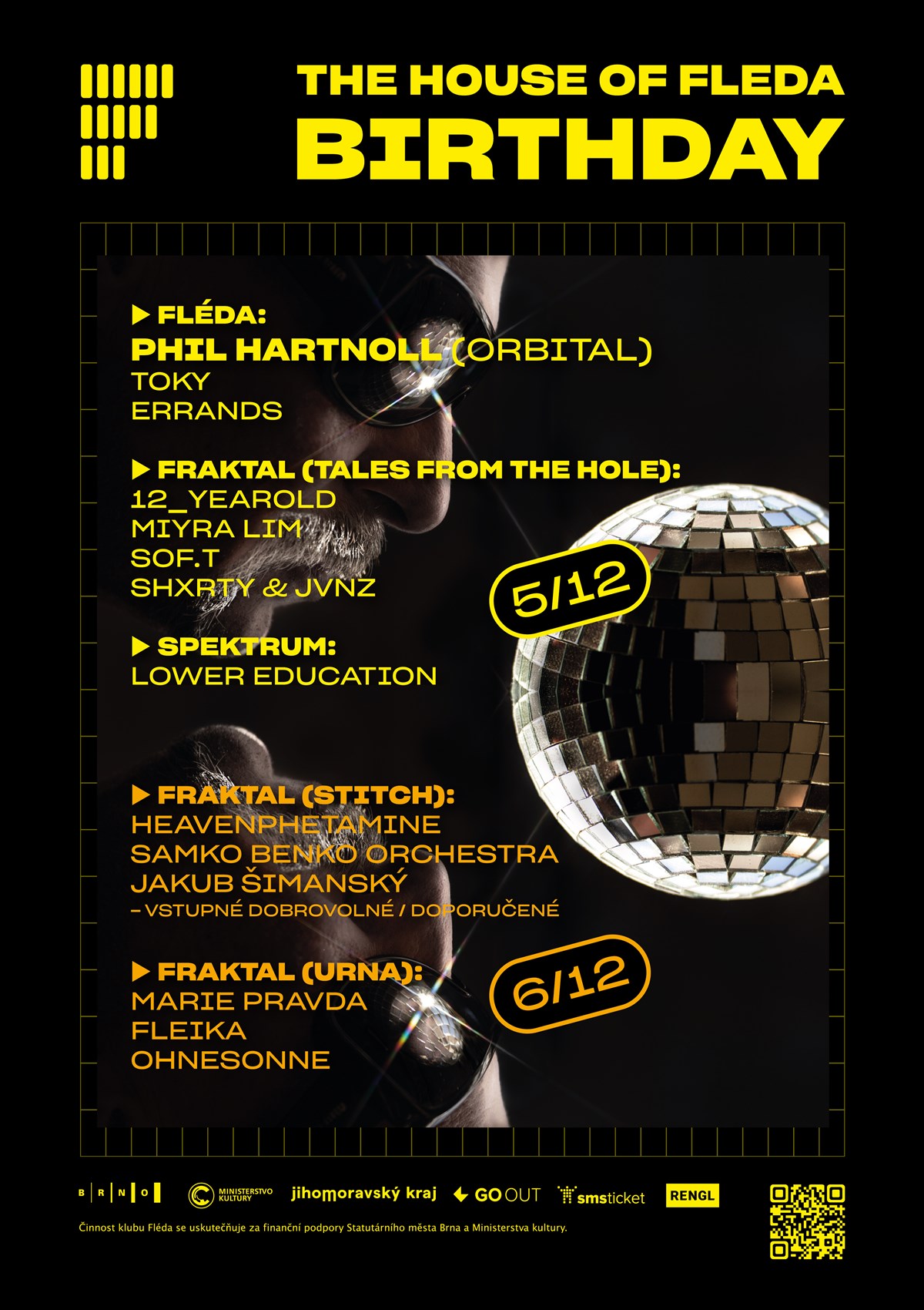 Jedno vstupné, dva večery a tři venues. Narozeniny, jaké tady ještě nebyly. Historie brněnské klubové scény se setká s její současností. Přijďte s námi oslavit 24. narozeniny Flédy a zároveň popřát klubu Fraktal a baru Spektrum vše nejlepší ke 2. narozeninám. THE HOUSE OF FLEDA BIRTHDAY startuje ve 20:00 v baru Spektrum!V pátek 5. prosince bude v hlavním sále Flédy na míru připravený prostorový zvuk, kde Phil Hartnoll (Orbital), DJ Toky a Errands zahrají speciální taneční sety uprostřed davu. V undergroundovém klubu Fraktal ve stejný den proběhne rave pod taktovkou rakouských interpretů 12_yearold, Miyra Lim, sof.t a SHXRTY & JVNZ a večer zahájí poslechovka v baru Spektrum s Lower Education.V sobotu 6. prosince proběhne ve Fraktalu další DIY akce Stitch, kam tentokrát dorazí Heavenphetamine, Samko Benko Orchestra a Jakub Šimanský. Živá produkce od post-punku po neo-folk, kterou následně vystřídá další edice Urny. Marie Pravda, fleika a Ohnesonne zajistí poctivý rave pro všechny přeživší.Těšíme se na všechny fanoušky Flédy, Fraktalu, Spektra a klubové scény obecně! Info ke vstupenkám:V prodeji jednodenní vstupenka na pátek i dvoudenní vstupenky. Vstupenky na sobotu budou k dispozici pouze na místě. Pro fanoušky, kteří rádi podpoří všechny naše kulturní prostory je k dispozici vstupenka Birthday Supporter na oba dny.DIY akce Stitch, která bude probíhat v sobotu ve Fraktalu není v ceně THE HOUSE OF FLEDA BIRTHDAY. Vstupné na tuto akci bude na místě dobrovolné / doporučené. Vybraný obnos jde přímo kapelám.Narozeninovou oslavu chceme udělat co nejdostupnější, proto jsme původní cenu 490 Kč změnili na 450 Kč a nechali jako dvoudenní vstupenku a cenu jednodenní vstupenky jsme snížili na 290 Kč. Všem, kteří už si koupili vstupenky v původním předprodeji přidáme ke každé zakoupené vstupence 1 dvoudenní vstupenku zdarma. >>> 5.12. Friday <<<start: 20:00► Spektrum - Listening Session:Lower Education(Odd Sounds) start: 22:00► Fléda - Massive Quadrophonic Soundsystem:Phil Hartnoll (Orbital)DJ TokyErrands(Rave, Techno, Melodic, Oldschool & Fresh) start: 22:00► Fraktal (The Hole) - Tales From The Hole:12_yearoldMiyra Limsof.tSHXRTY & JVNZ(House, UKG, Breaks) >>> 6.12. Saturday <<<start: 19:00► Fraktal - Stitch:HeavenphetamineSamko Benko OrchestraJakub Šimanský(Post-punk, Neo-folk)DIY akce Stitch není v ceně THE HOUSE OF FLEDA BIRTHDAY. Vstupné dobrovolné / doporučené. Vybraný obnos jde přímo kapelám. start: 23:00► Fraktal (The Hole) - URNA:fleikaMarie PravdaOhnesonne(Techno, Allnighter)