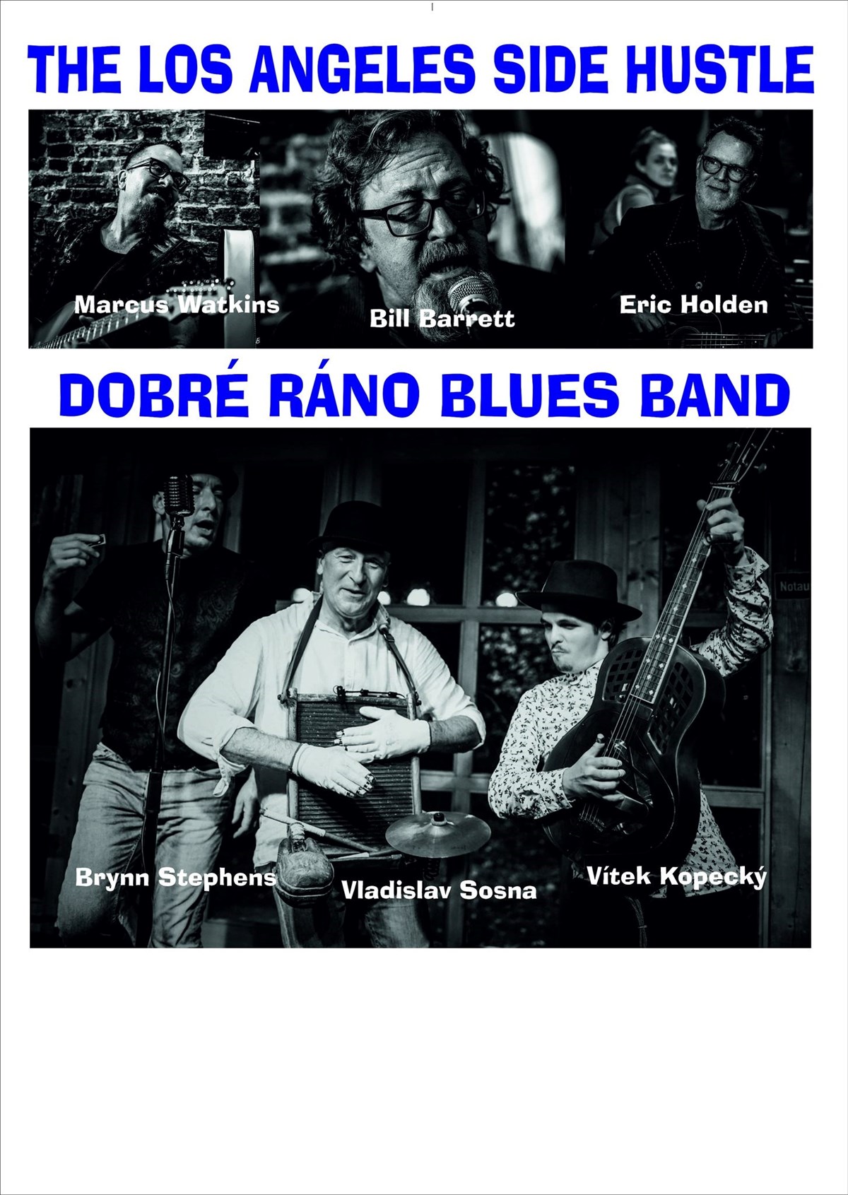 LASH poprvé v ČR, první ze dvou koncertů. The Los Angeles Side HustleBILL BARRETT - jeden z nejlepších světových hráčů na foukací harmoniku a vynikající zpěvák. Během třicetileté kariéry vystupoval a nahrával s mnoha světoznámými umělci i orchestry, například s L.A. Philharmonic, The Kronos Quartet nebo Natalie Merchant, ve skupině The Neptune Blues Club po boku kytaristy Marca Forda (dř. The Black Crowes) nebo bubeníka Stephena Hodgese (hrál a natáčel s Tomem Waitsem jeho nejlepší alba)...MARCUS WATKINS - Marcus vystupoval vystupoval po celém světě a nahrával s mnoha různými umělci (mj. Nina Hagen, Eric Burdon, Johnny Hallyday, Lucinda Williams….). Jeho hru na kytaru lze slyšet na mnoha nahrávkách, ve filmech a televizních programech. Marcus je úspěšný i jako skladatel a textař. Nahráno bylo mnoho jeho skladeb od filmové hudby/soundtracků (I Love You Man) až po legendární umělce (Eric Burdon).ERIC HOLDEN - Baskytarista a producent Eric Holden spolupracuje s indie, velkými nahrávacími společnostmi a hvězdnými umělci již léta. Mezi ty, s nimiž nahrával, patří The BoDeans, David Foster, John Williams, Josie Cotton, Nina Hagen, The Weepies, Adrianne Gonzalez, Five For Fighting, Richard Marx či Josh Groban…. Účastnil se turné se Shakirou, The BoDeans, Vertical Horizon, Joshem Grobanem, Leehom Wangem, Five For Fighting a mnoha dalšími. Můžete ho slyšet a vidět na DVD „Live“ a „Live at the Greek“ od Joshe Grobana, DVD „Live in Paris“ od Shakiry…Dobré ráno blues bandVLÁĎA SOSNA – Bubeník a showman, hrával mimo jiné s Petrou Janů, Marikou Gombitovou, Ondřejem Havelkou i v Abraxas. Objevil se ve filmu Akumulátor a seriálu Četnické humoresky. BRYNN STEPHENS – zpěvák a hráč na foukací harmoniku. Rodák z kalifornského Los Angeles. Zpíval v blues bandu legendárního kytaristy Luboše Andršta. VÍTEK KOPECKÝ – vynikající kytarista. Spolupracoval s Ivanem Hlasem a kapelou Vanua2.